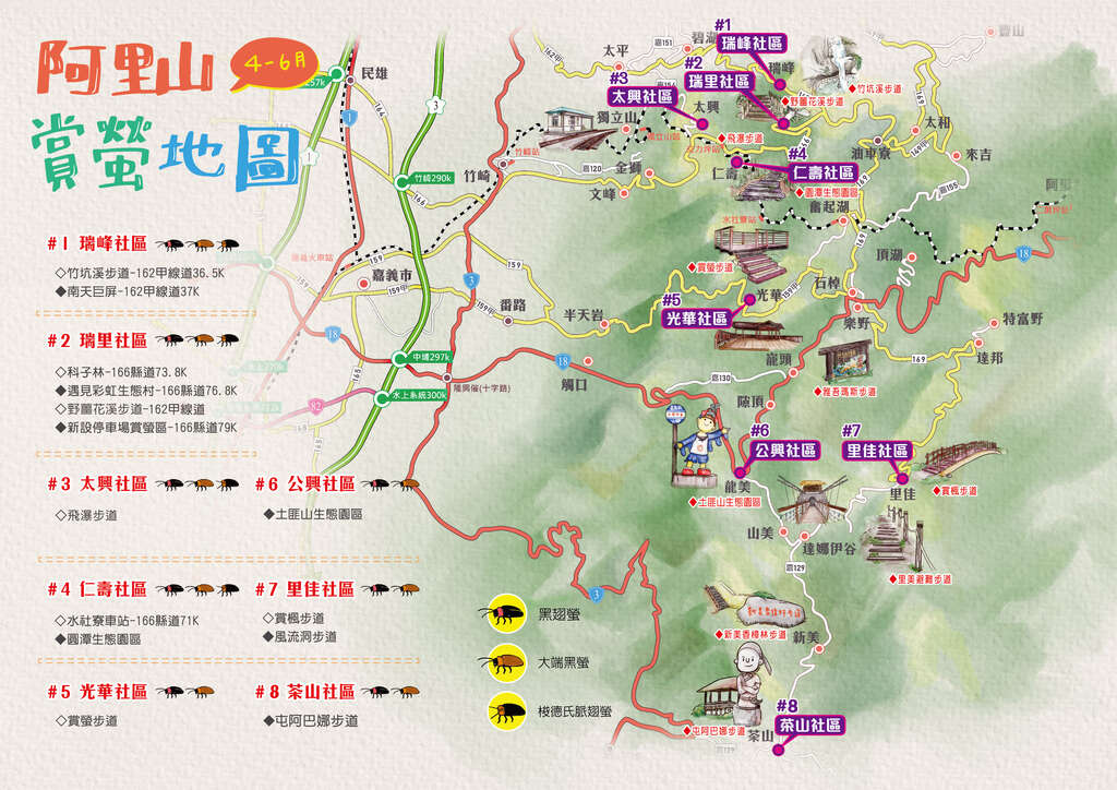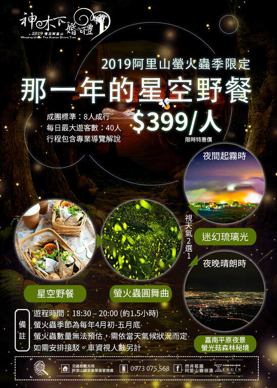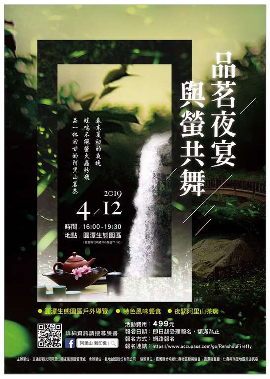 The highly anticipated firefly season of Alishan National Scenic Area starts in April. Every year at the end of Spring and the beginning of Summer, tens of thousands of fireflies gather here, making a magnificent sight. Alishan National Scenic Area Administration, Tourism Bureau, MOTC, collaborates with local communities to launch guided tours and events during the firefly season, including the “Tea party at night with the fireflies” on April 12 at Yuantan Creek Ecological Park. Combing the firefly ecology with tea setting, with talks by local tea and travel experts, local tourism and Alishan tea culture are promoted. At Yuantan Creek Ecological Park, firefly guided tours are available every Friday, Saturday, and Sunday from April 13 to May 19. A “bounty hunter” event is held at Lijia tribe on April 13 to 14. Through Tsou tribal culture experiences and firefly guided tours, visitors can learn about the culture and ecology of Alishan. The “Tea with the fireflies – welcome to the party” event held at Gongxing Tufeishan Ecological Park every Saturday and Sunday between April 5 and May 4 is a special event where tea tasting and firefly watching can be done on a starry night surrounded by tung tree flowers. Guided by local experts, you can walk into the forest full of wonders. With the guidance, you will also learn about the history of Tufeishan in the romantic atmosphere. In addition, the romantic “Starry sky picnic” at Leye Tribe is held between April 10 and May 30 in accordance with the firefly season.