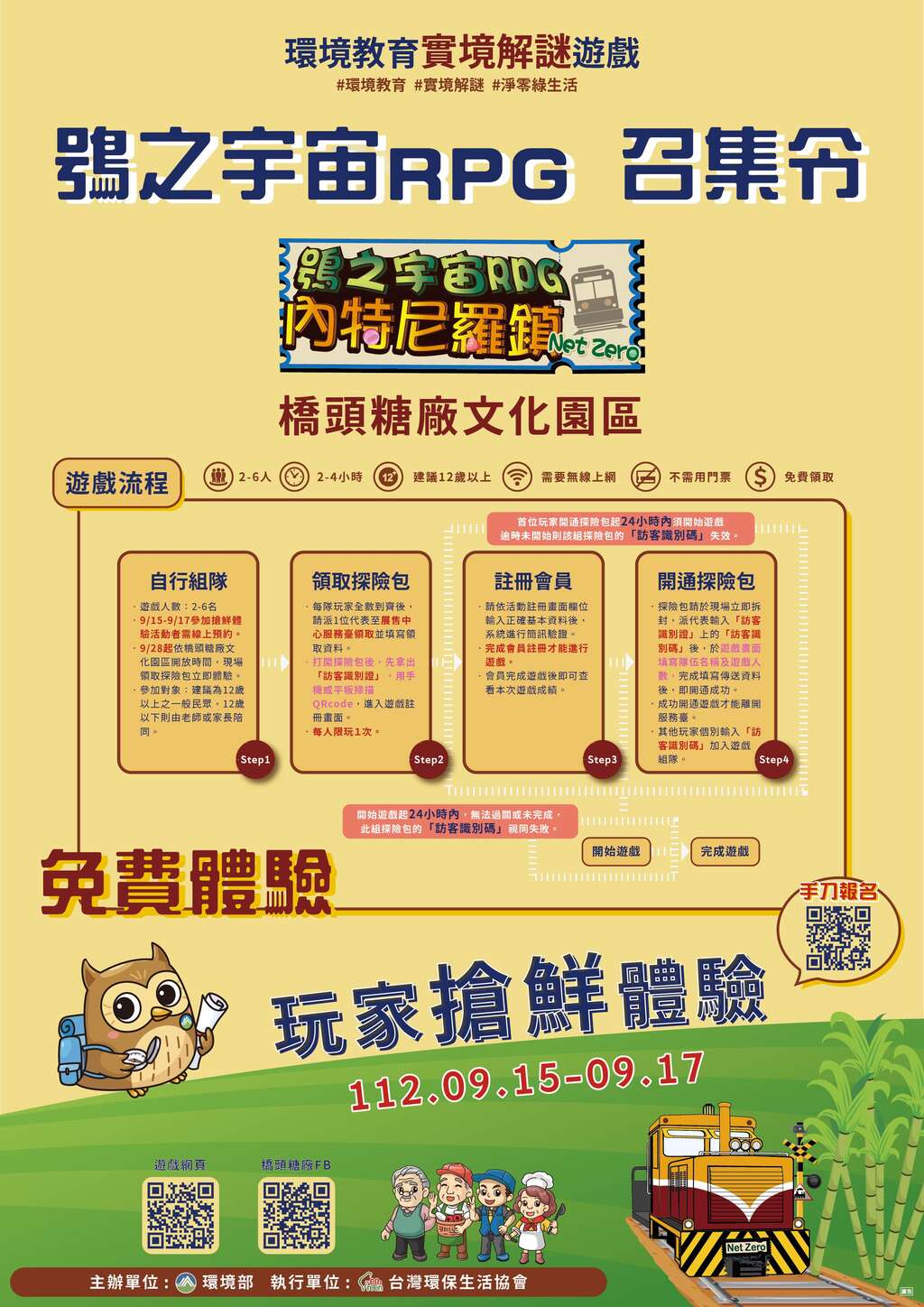 為鼓勵民眾走出戶外,實際至環境教育特色場域認識環境,活動以實境解謎遊戲,結合橋頭糖廠文化園區之環境教育設施場所資源,並扣合「淨零綠生活」政策,設計出6個主題關卡之「鴞之宇宙RPG-內特尼羅(Net Zero)鎮」遊戲(含2個線上主題關卡),讓民眾在實境解謎過程中學習綠生活知識,進而珍惜地球資源,落實保護環境行動,達成淨零綠生活目標。