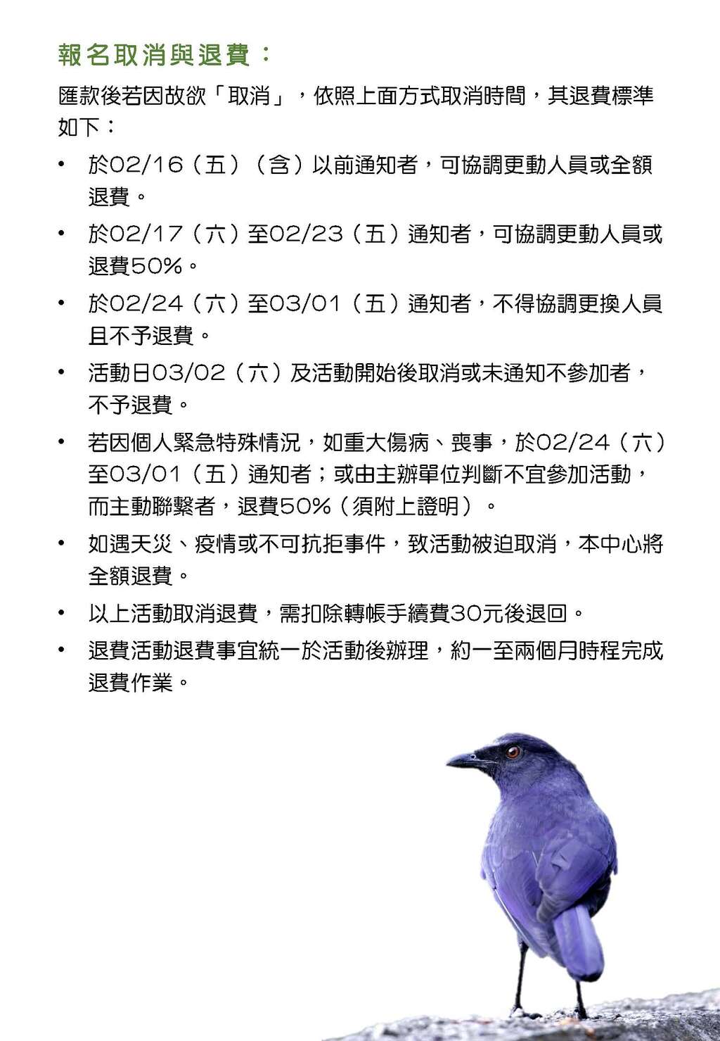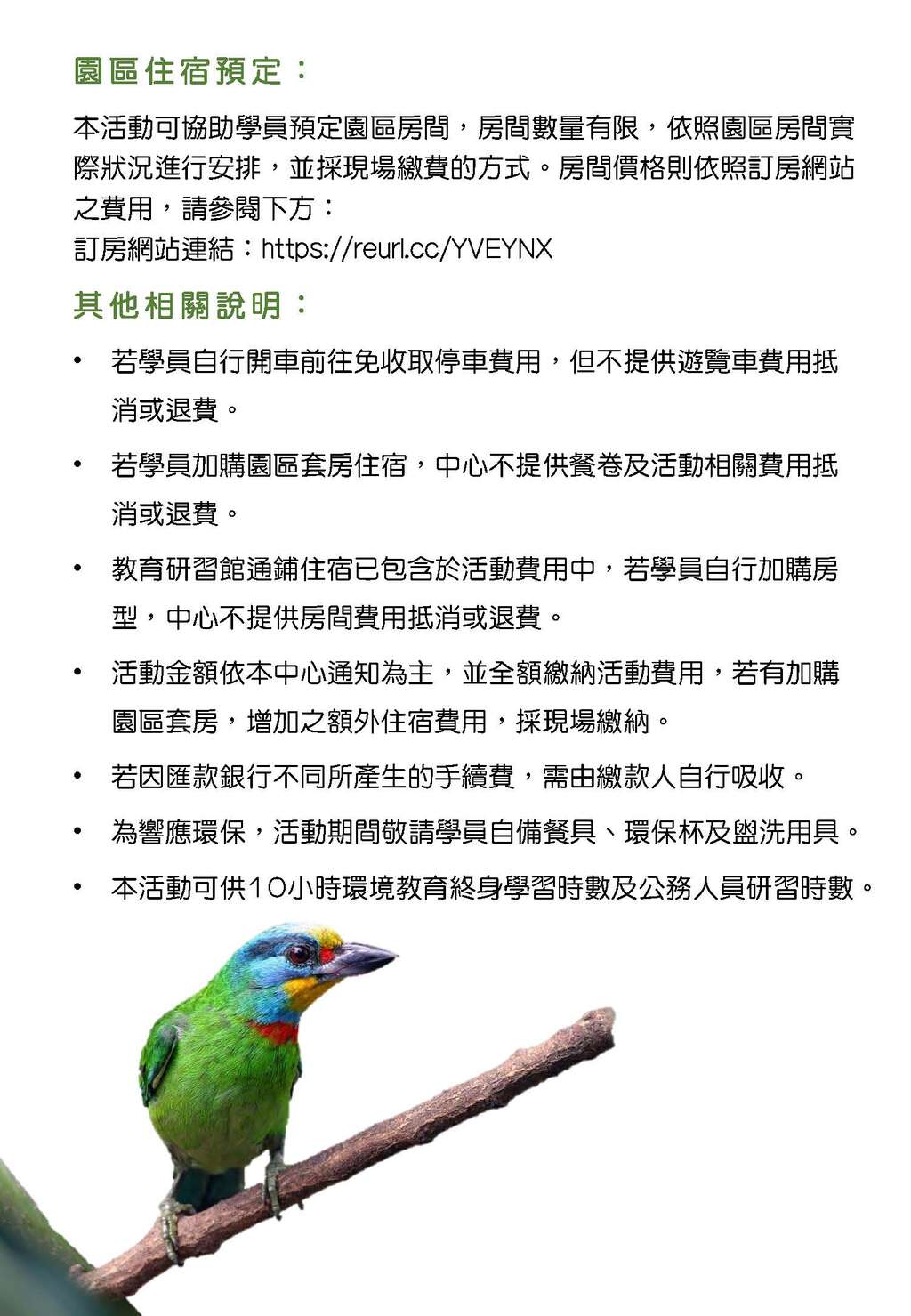 二、本次研習參加對象為各級學校教師、機關人員,或年滿16歲對鳥類有興趣之民眾,活動人數上限24人,「山林悠遊網」線上報名,113年2月9日前完成報名者享有早鳥優惠價,詳情請參照簡章。