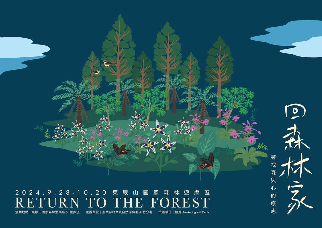 農業部林業及自然保育署新竹分署今(113)年以「回到初心‧森林療癒」概念為策劃原點,規劃於連續四周假日依循萌芽、慶典、體驗、感恩的流轉,引領遊客透過不同型態活動(如音樂、互動戲劇、手作坊等方式)進入東眼山的療癒之旅,活動期間周末(9月28-29日、10月5-6日、10月12-13日、10月19-20日)皆有不同主題活動,誠摯邀請貴單位共襄盛舉。