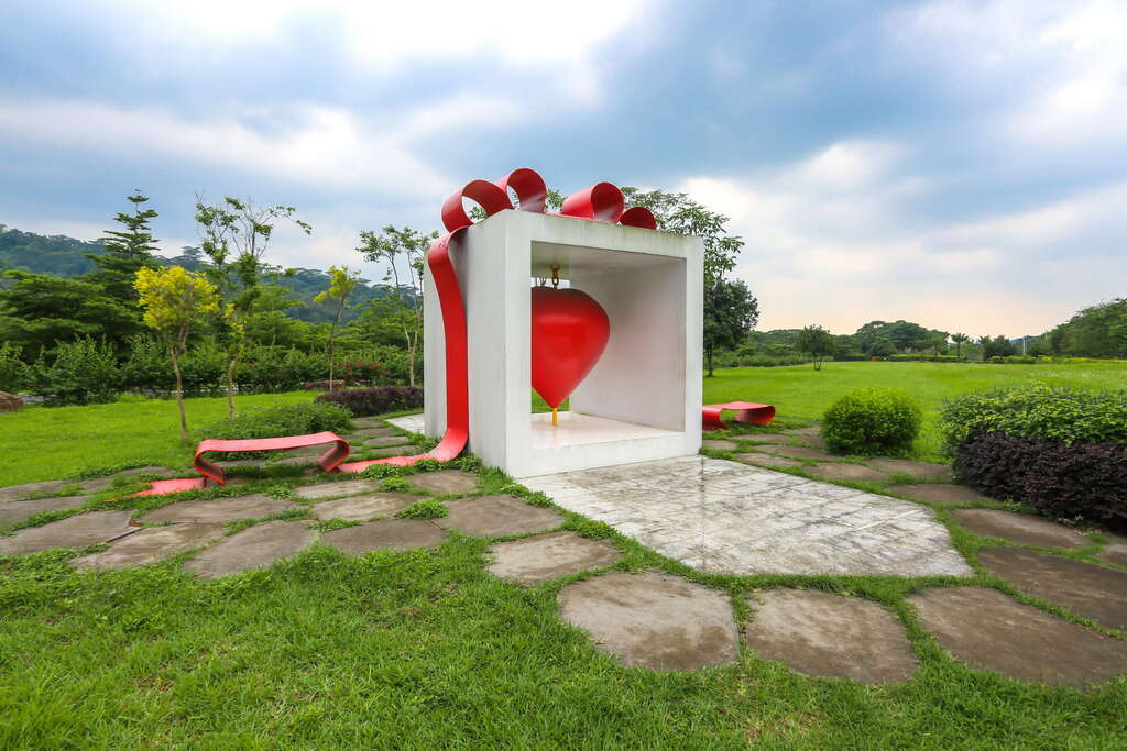 「牛埔仔遊憩園区(愛情シルクロード)」は台18線の32K付近にあり、「阿里山国家風景区」へ向かう際の入り口のような位置にあります。園内のインスタレーションは「愛情」と「阿里山」を創作のテーマとしており、見渡す限りの草原に立つ、建物一階の半分の高さほどの純白のギフトボックスの中には、燃えるような真っ赤なハートが立っています。赤と白のアート作品は、緑の草地でとりわけ目を引き、恋人たちに甘い思い出の時を届けています。