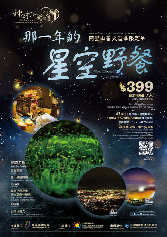 「神木下結婚式」の夏のロマンチックツアーは、近年流行のピクニックを組み合わせました。また阿里山はちょうどホタルの季節でもあることから、「あの夜 星空ピクニック」と題して阿里山限定版ツアーを催行します。5月30日(天候により調整)まで「然井茗露×阿里山霧很濃」で集合し出発。ホタルの光と星明かりの下、ピクニックをお楽しみいただけます。公式サイトからお申込みください。