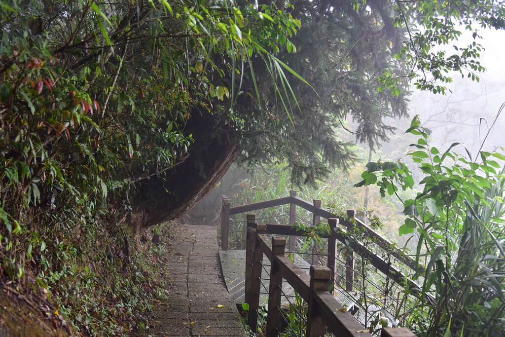 Due to the thick fog in the afternoon and the humidity in this mountain region, there are no shortages in tall arbors like Indian-charcoal Trema, and other plants such as Giant Elephant’s Ear and bananas flourish here. It’s quite a brisk walk down the rough flagstone-paved step trail that follows the slope of the mountain. As you travel down to the mid section of the mountain, you will see Taiwan Yuhina, Taiwan barbet, and many other species of birds endemic to Taiwan perched on the tree branches. Notice the Makino bamboos scattered in the forest benting gently, showing their flexibility. There’s also a firmly rooted Chinese fir on the side of the slope that blocks your view directly in front - a trail that leads to the east side.
