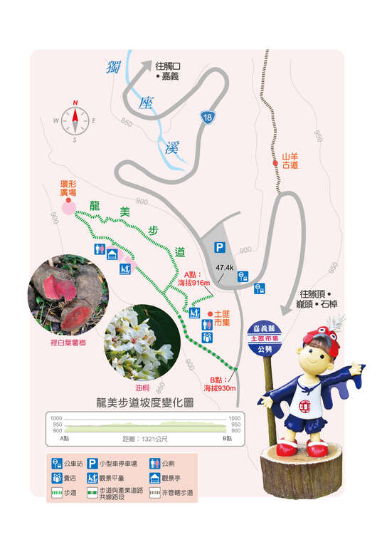 行至「台18線」47.4公里處,路旁有一大型停車場,而停車場的對面是「土匪山」,一旁為龍美步道的入口,除了入口向上攀爬的木棧階梯較為陡峭之外,其餘皆為坡度平緩的路段。依山形地勢搭建的木棧道走來輕鬆,沿途有新設立的觀景平臺,以及可供歇腳的休憩椅等設施之外,還有油桐、樟樹、水同木、臺灣杉等多種植物構成的植物群像,散放山野氣息。駐足徜徉其間,不絕於耳的蟬鳴,帶來自然的環繞音場效果。密林深處,也常有松鼠、臺灣獼猴出沒。