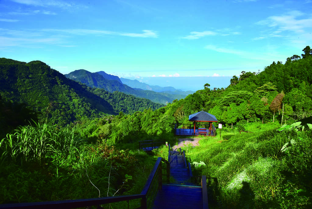 靠南端這一段的仿木階梯,即使是上坡,走來亦不費力。沿途除了茶田之外,還有桃樹和農園。攀升至中點涼亭,回望山谷,映入眼簾的是壯闊的群山景觀。