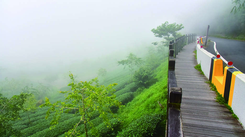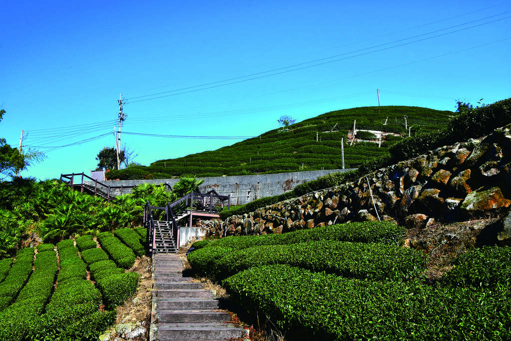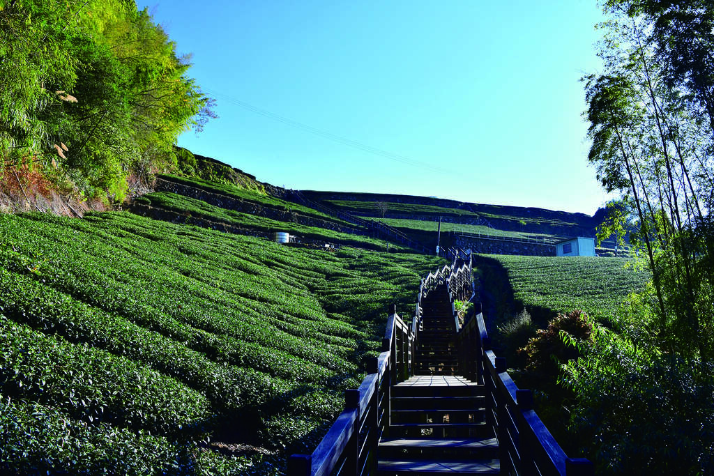 走到產業道路對面的木棧階梯, 隱沒在濃密的竹林裡。經過一段向上爬升的轉折路線之後,來到一處滿是碧綠茶園的山坡。隨著木棧階梯緩緩而上,環繞的茶園景觀也愈加廣闊,直到頂端與產業道路相接的出入口在望,您也即將完成這一段風貌多樣的步道之旅。