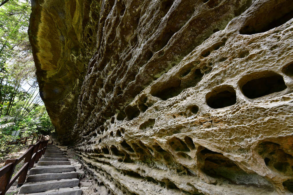 當您下降到竹坑溪北岸、沿溪而行,有一個不起眼的樹洞,為早期取得野生蜂蜜的開口,顯示了早期瑞里人的生活智慧。位於步道中點的蝙蝠洞、燕子崖為相鄰的岩壁,總長約230公尺,其下方凹壁為河流侵蝕所致。寬約40公尺的燕子崖,為泥質砂岩夾頁岩組成的平行層狀凹凸面,蝙蝠洞的岩面,則佈滿大小不一的孔洞,皆屬難得一見的地形地貌。