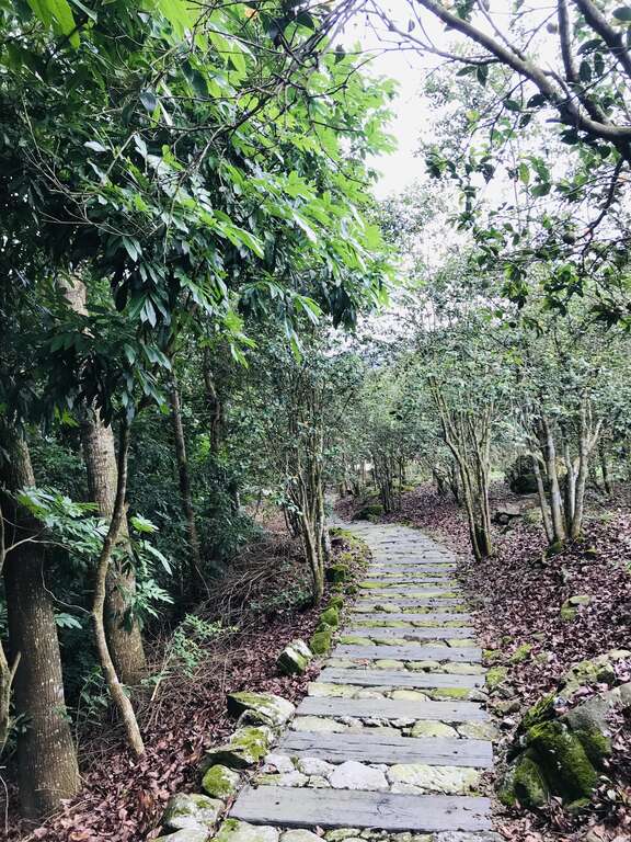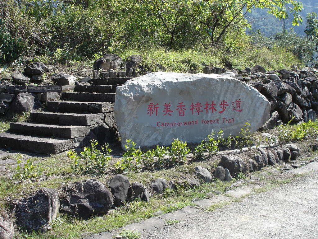蜿蜒爬升的步道,數度與產業道路交會。過了第一處與產業道路交會的路口之後,持續往密林深處前進,不久即可看到幾棵樹形高挑的樟樹,矗立在步道旁。隨後來到一處觀景臺,環視四周的樟樹群,呼吸空氣中沁人心脾的微香。7~8月間,樟樹結出果實的時節,也吸引眾多鳥類前來。續往前行,一處位於步道最高點的觀景亭,可在其間享受靜謐中的 悠閒。休息片刻之後,隨下坡路段緩緩而降。沿途的景觀漸漸轉換為叢生的麻竹、杉木,以及闊葉樹組成的次生林。緊接著出現的農園, 其上有村民種植的薑、柑橘等作物。而這裡也已接近步道南段與產業道路交會的地帶。