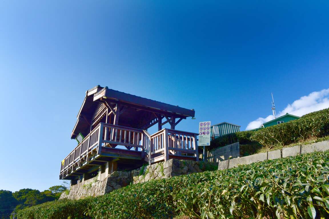步道終點為二尖山休閒茶園,號稱最高景點,並設置一座雅致涼亭,閒坐其中,涼爽的山風拂面而過,茶園似一片綠毯順著山勢往下延伸,與遠方層層疊疊的山巒銜接,美景如世外桃源。