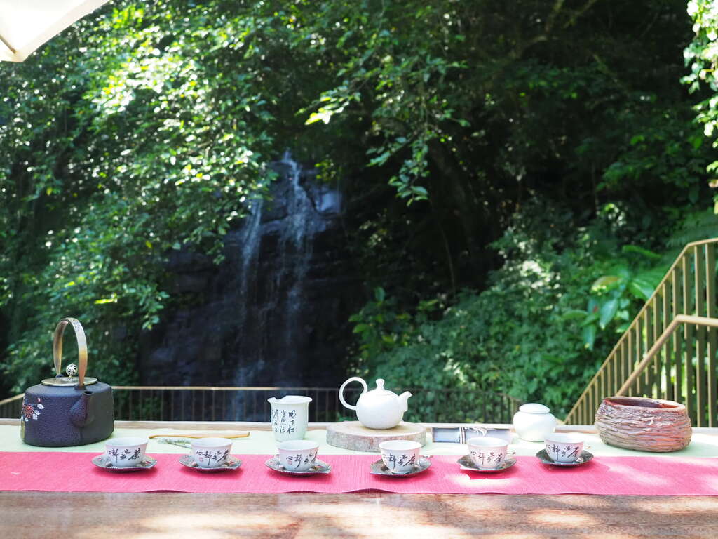 從步道西側一端進入,沿木棧階梯而下,耳際傳來潺潺的水聲,不一會兒即抵達一處觀瀑平臺。其上擺設的原木桌椅,不僅提供日常休憩,也是舉辦茶席的理想地點。