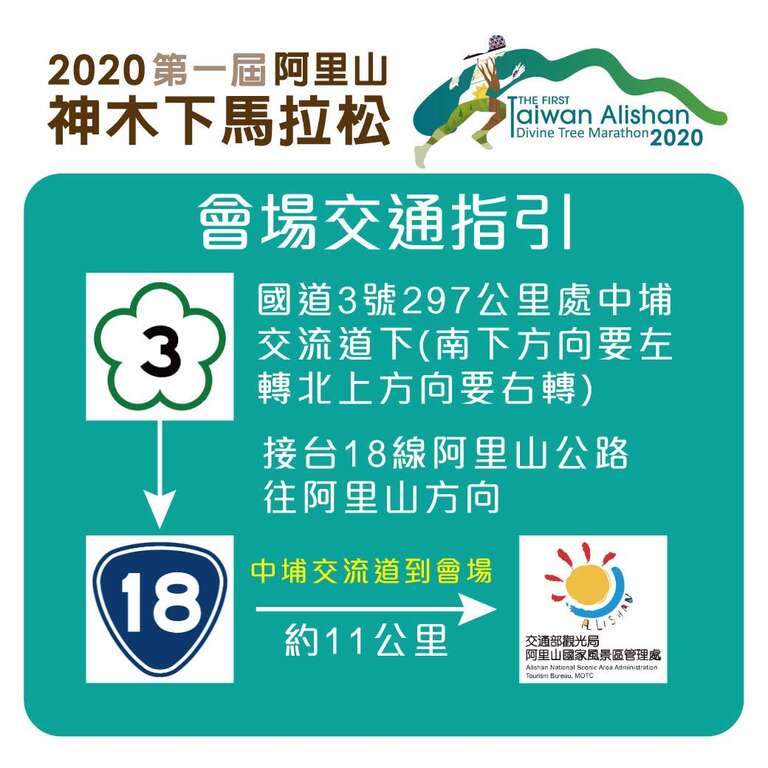 交通部觀光局阿里山國家風景區管理處(以下簡稱阿里山管理處) 原訂於109年4月12日辦理「第一屆阿里山神木下馬拉松」,因應嚴重特殊傳染性肺炎疫情期間,鑑於跑者健康及維護公眾利益考量,並配合中央流行疫情指揮中心公布避免大型集會活動之防疫決策,將延期至109年11月22日(星期日)辦理