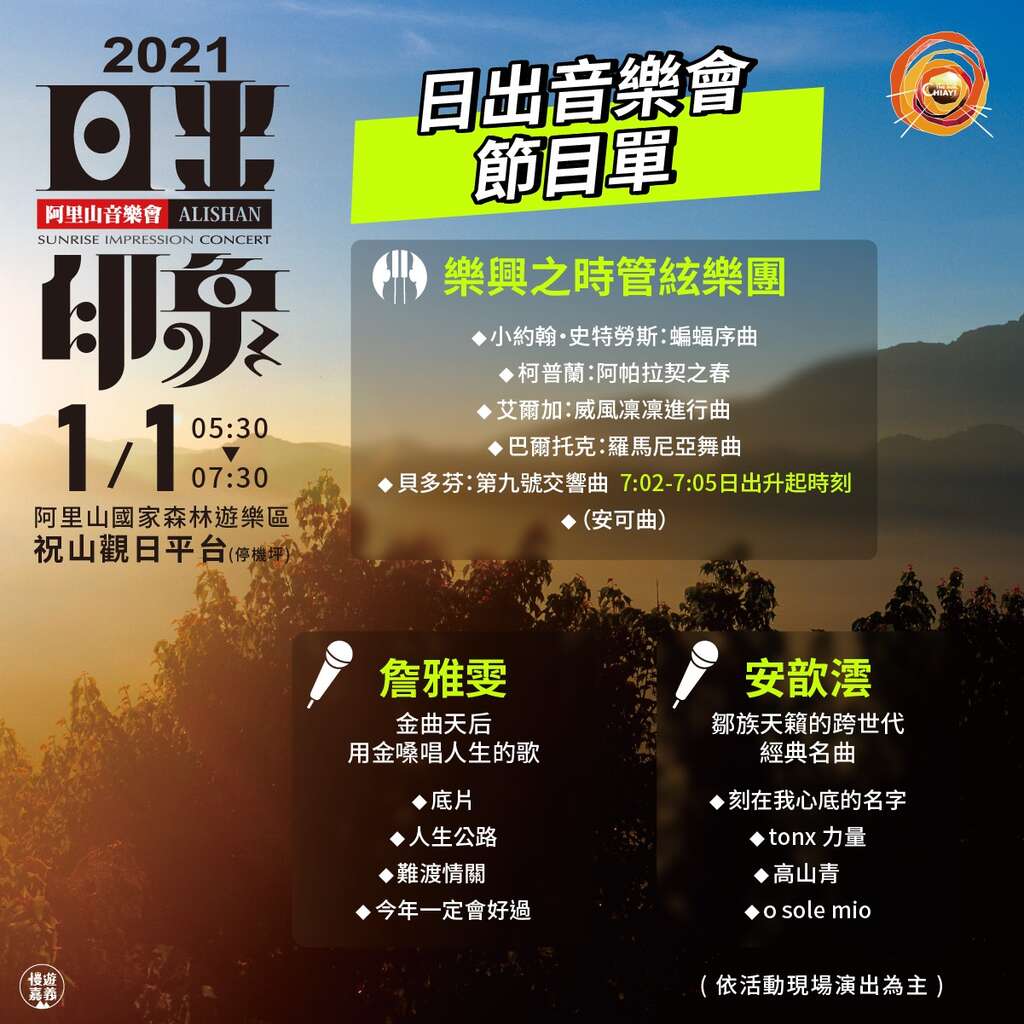 - 原日出印象音樂會及活動現場兌換小禮物,因防疫一同取消,敬請見諒。