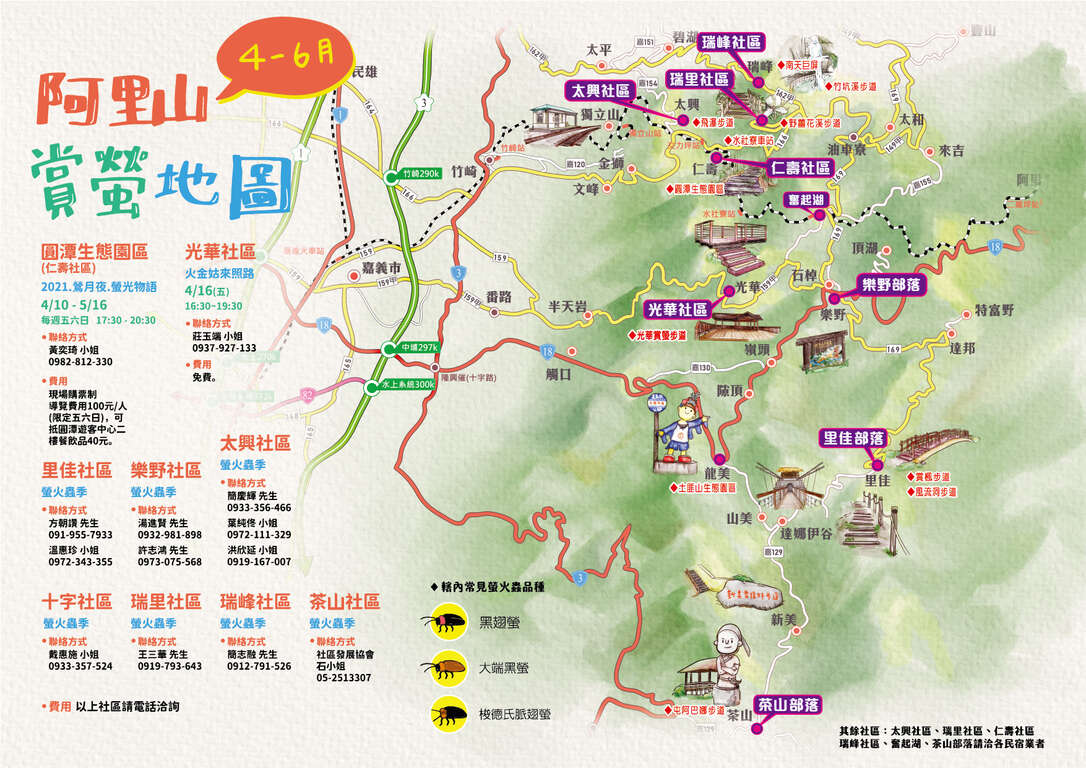 阿里山螢火蟲季是結合多個在地社區、部落(含太興、瑞里、仁壽、瑞峰、奮起湖、十字、光華、里佳、樂野、茶山)推出的夜間賞螢導覽及體驗活動,包括:圓潭生態園區推出【2021.鶯月夜.螢光物語】活動;擁有五星生態(星空、螢火蟲、白面鼯鼠、螢光蕈、高山鯝魚)的光華社區辦理【火金姑來照路】活動;太興社區舉辦【螢光照亮太興.螢河鐵道】活動;及鄒族部落的里佳、樂野、茶山社區等皆提供預約制【夜間賞螢導覽服務】,結合在地人文產業與生態結合的觀光體驗,詳細情形可參考各社區、部落辦理的活動。
