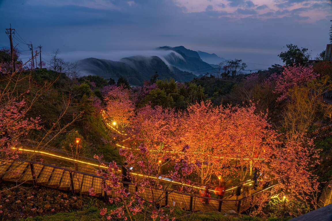 以獨有夜晚「賞櫻」為話題,沿途步道點燈形成美麗光景,為彰顯阿里山特色,結合櫻花樹下品茗及浴衣體驗,塑造微出國到日本賞櫻的氛圍,引領風潮來到石棹觀光。