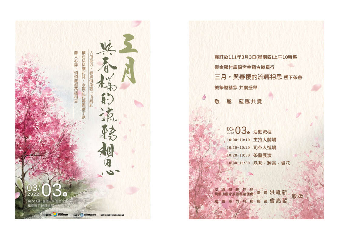 一場不只是茶席的櫻下約會,串連著金獅村民的起心動念:為盛宴題字,割竹造籬;為對聯糊紙,刻竹做杯;揉合茶櫻意象品茗製餅,席前一只薄紙也寫滿心思。八重櫻盛開當前,富士櫻接續等待展露花顏;從一帖邀約延續至會場的濃厚氛圍,出自每份無私投入的雙手,環環相扣的金獅美學,完整了這場古道最隆重的春宴。