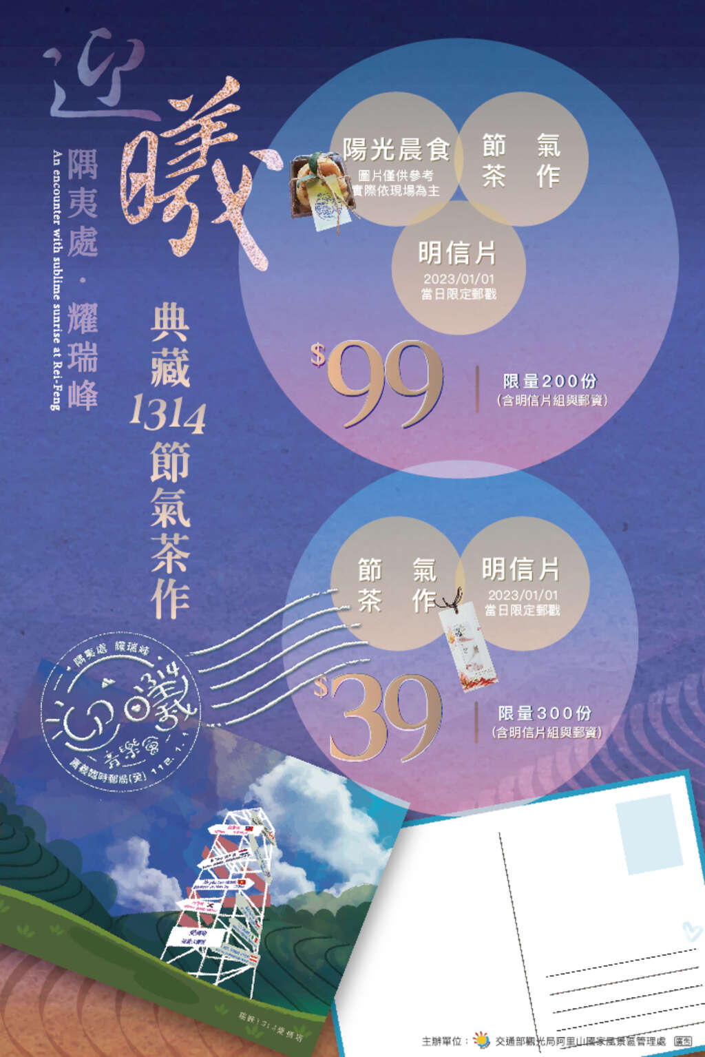 今年的活動特別推出「典藏1314節氣茶作組」限量販售,結合阿里山冬蜜紅茶、1314明信片與1314紀念郵戳,邀請遊客們一起在海拔1314將新一年的深切祝福送給所念之人。