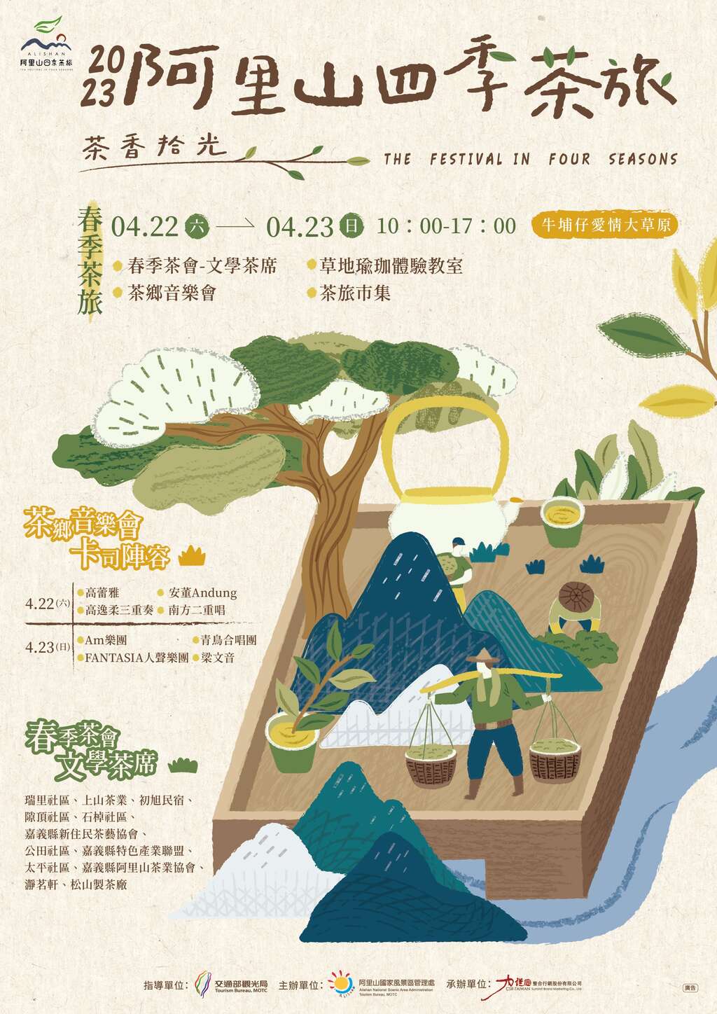 活動日期: 2023-04-22 10:00~2023-04-23 17:00 主辦單位: 交通部觀光局阿里山國家風景區管理處 地址: 嘉義縣番路鄉牛埔仔愛情大草原 各活動時間以主辦單位最新公告為主 加入iOS行事曆 加入Google行事曆 訊息內容茶鄉音樂會/文學茶席/草地瑜珈/茶旅市集 帶上家人朋友走進屬於春天的茶系阿里山之旅吧🍃 🎶〚茶香音樂會〛 美聲不間斷!梁文音、高蕾雅、南方二重唱、Am樂團等溫暖清新好聲音伴你左右 🍵〚文學茶席〛 以茶之道聞名的阿里山,藉由文學詩詞意境入茶,提煉出多種風格茶席 免費報名連結 🧘♂️〚草地瑜珈體驗教室〛 環繞在大自然的懷抱中,接受芬多精的洗禮,享受草地瑜珈課程,舒緩緊繃的身心靈 免費報名連結 📣〚茶旅市集〛 好玩好買好逛!在地深入茶旅、手做DIY體驗等特色市集等你逛相關照片 上一則 回列表 下一則