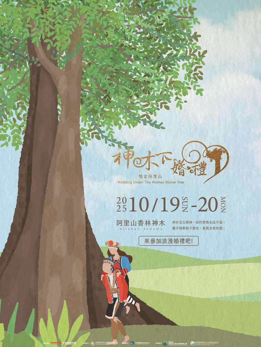 交通部觀光署為推廣臺灣浪漫之旅,將「阿里山神木下婚禮」納為「臺灣觀光雙年曆」國際級活動之一,朝向國際級浪漫旅遊活動方式辦理,並成為海內外新人舉辦婚禮、渡假蜜月及拍攝婚紗的首選。神木下婚禮自2007 年舉辦至今將邁入第19年,累積共計384對新人見證,本活動已成為眾人熟知的浪漫阿里山品牌,為新人打造獨一無二的特色婚禮體驗,如神木般千年不變的愛情誓言,您一定不能錯過!