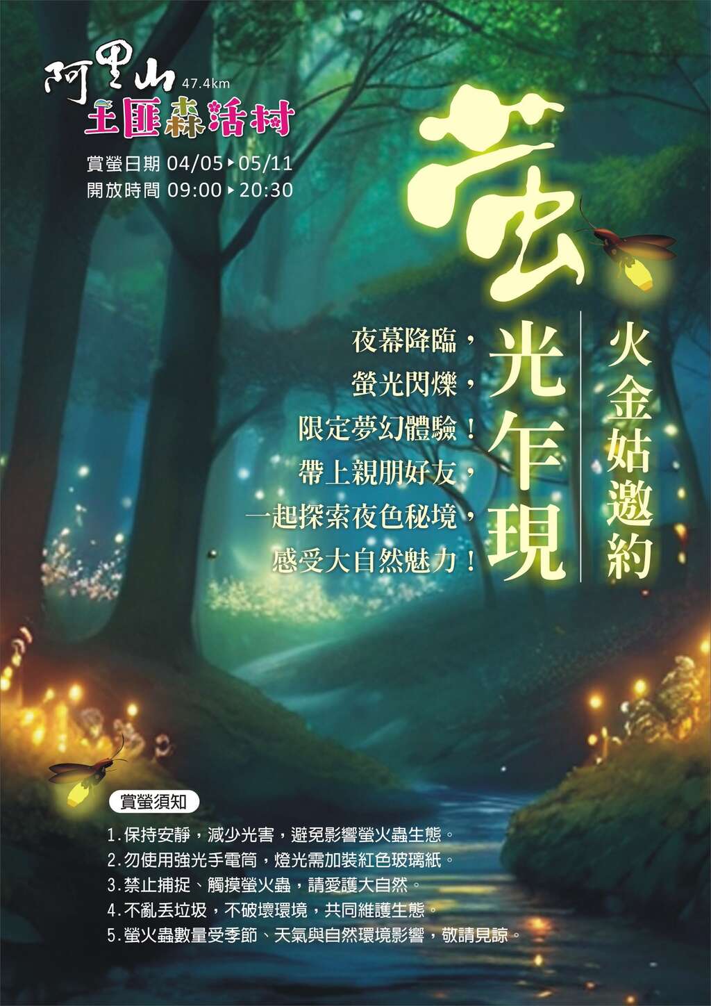 阿里山地區螢火蟲生態資源相當豐富,堪稱是臺灣中南部地區觀賞螢火蟲的最佳寶地,每年夏季4至6月間正是黑翅螢與大端黑螢大量繁殖與出沒的季節,當夜晚到來時,螢火蟲便開始點亮起一盞盞微光,翩翩飛舞穿梭在樹林草叢間,就像繁星點點擁抱了整個阿里山的夜晚一樣,讓視覺感官增添了一種奇幻靜謐的感受,非常值得上山來體驗。