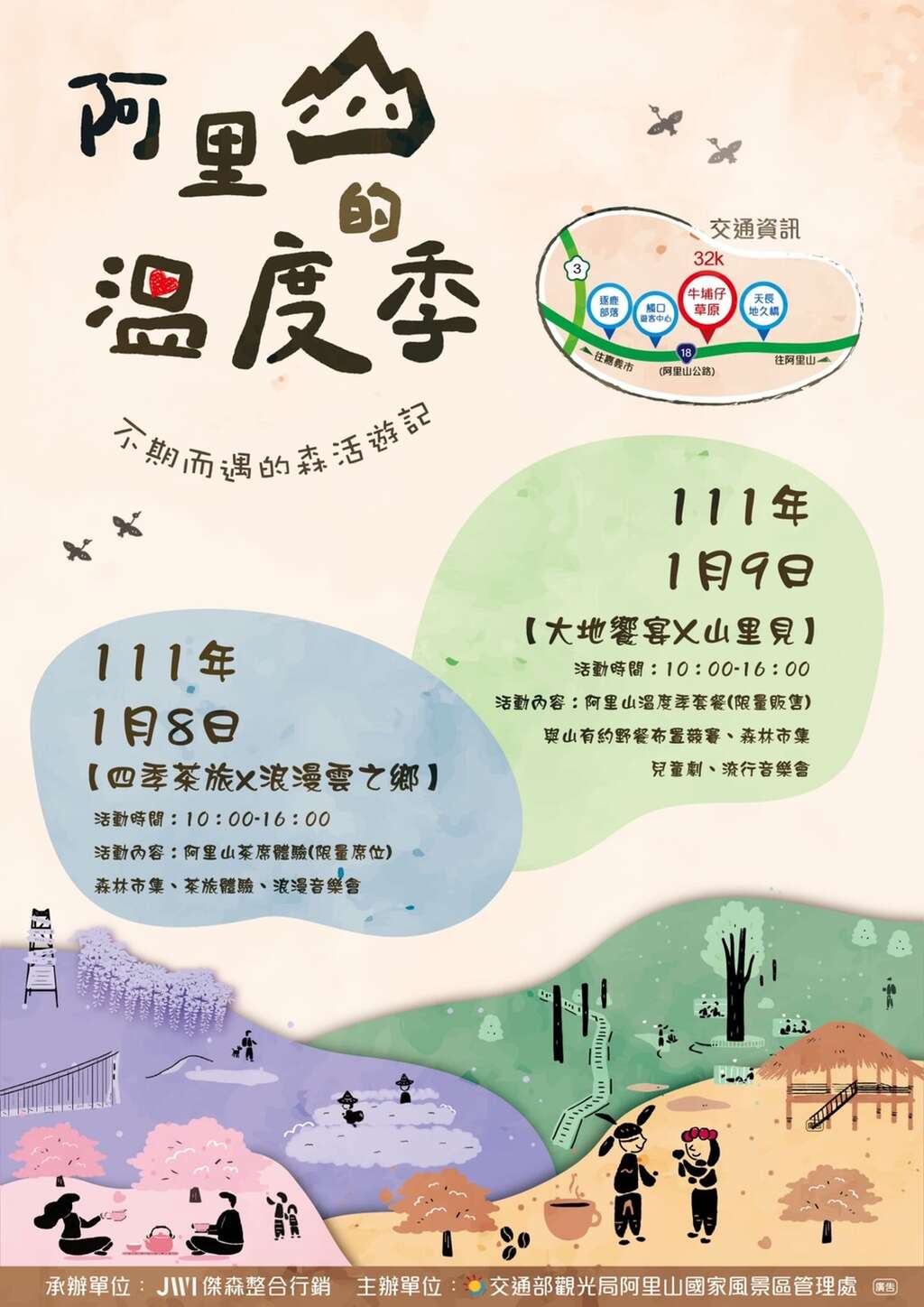 明年阿里山溫度季的一系列活動,將由2022年1月8、9日的主題活動正式開跑,兩日的活動在觸口牛埔仔大草原舉辦,除了邀請享譽國際的「十鼓樂團」、榮獲亞洲音樂大獎(MAMA)以及最佳亞洲藝人(華語)殊榮的「告五人」、台灣電子療癒天團「原子邦妮」、鄒族原民歌舞的精采演出之外,同時規劃了「四季茶旅X浪漫雲之鄉」、「大地饗宴X山里見」,現場設置阿里山特色的四季茶席、大地饗宴的野餐、特色市集、親子遊戲等。此外,也在阿里山風景區陸續規劃十項系列活動,包含:阿里山四季茶會、石棹春櫻夜、瑞里紫藤花季、螢火蟲季、太和茶李王、新美pasu x熬逗逗、太興萬鷺朝鳳、二延平步道遊蹤、阿里山國際茶藝學校等。
