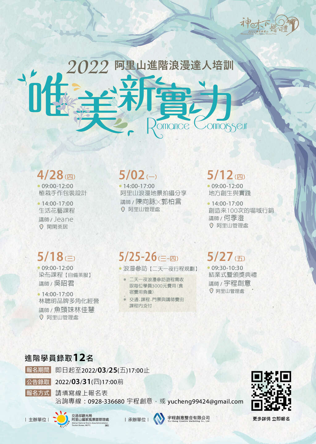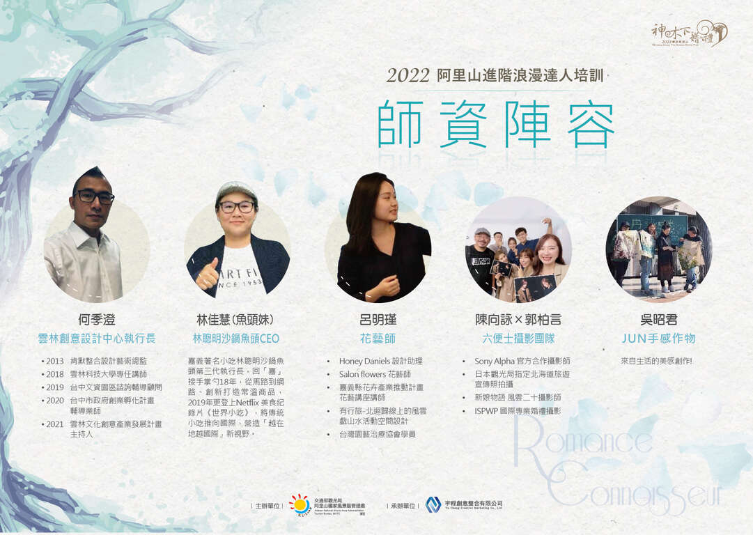 阿里山擁有得天獨厚的浪漫美景 -神木、日出雲海森林生態星空,這些自然賦予的硬體資源,經由交通部觀光局阿里山國家風景區管理處打造浪漫品牌持續不斷展現給國內外旅客熟知,同時也致力軟實經營2018年起透過推廣浪漫達人培訓計畫,讓浪漫阿里山品牌與在地業者一起成長茁壯。 於2021年開始進階學員培訓,2022年也將規劃初階全新課程,讓學員可以吸收到與時俱進的浪漫行銷能力。