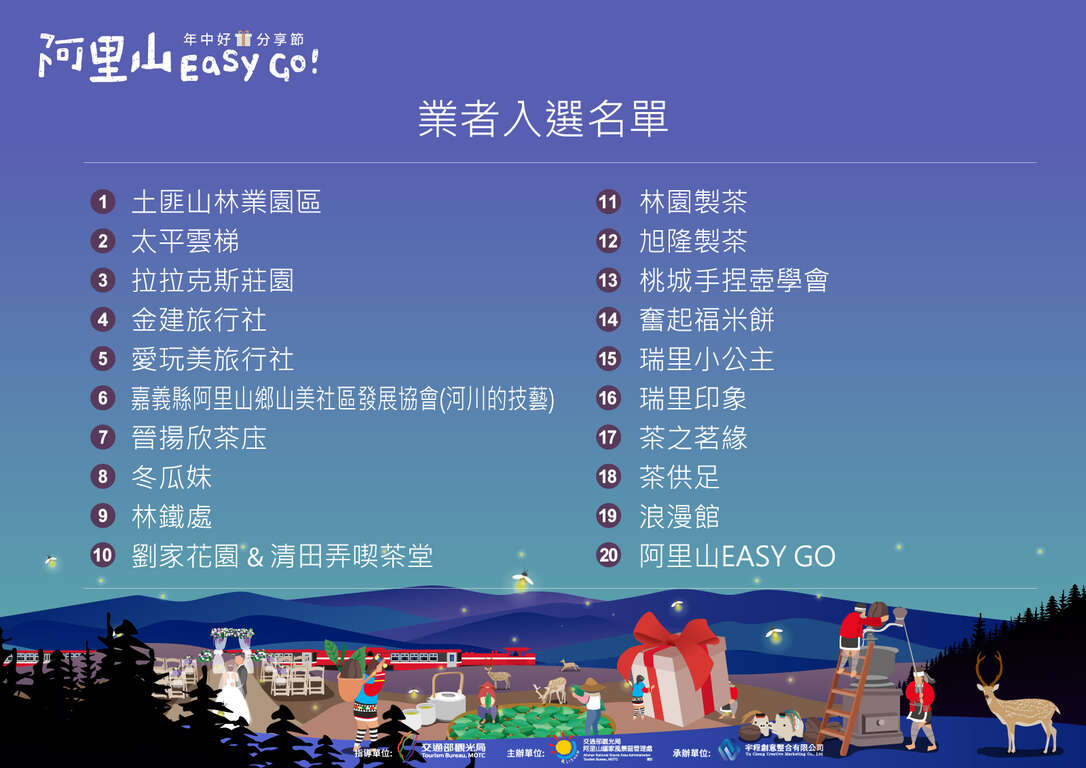 訊息內容業者入選名單公告 ◆活動日期:111/5/20(五)-111/5/22(日) ◆參展說明會日期:111/5/17(二) 14:00~15:00 ◆說明會地點:阿里山國家風景區管理處 環評教室 相關照片 上一則 回列表 下一則