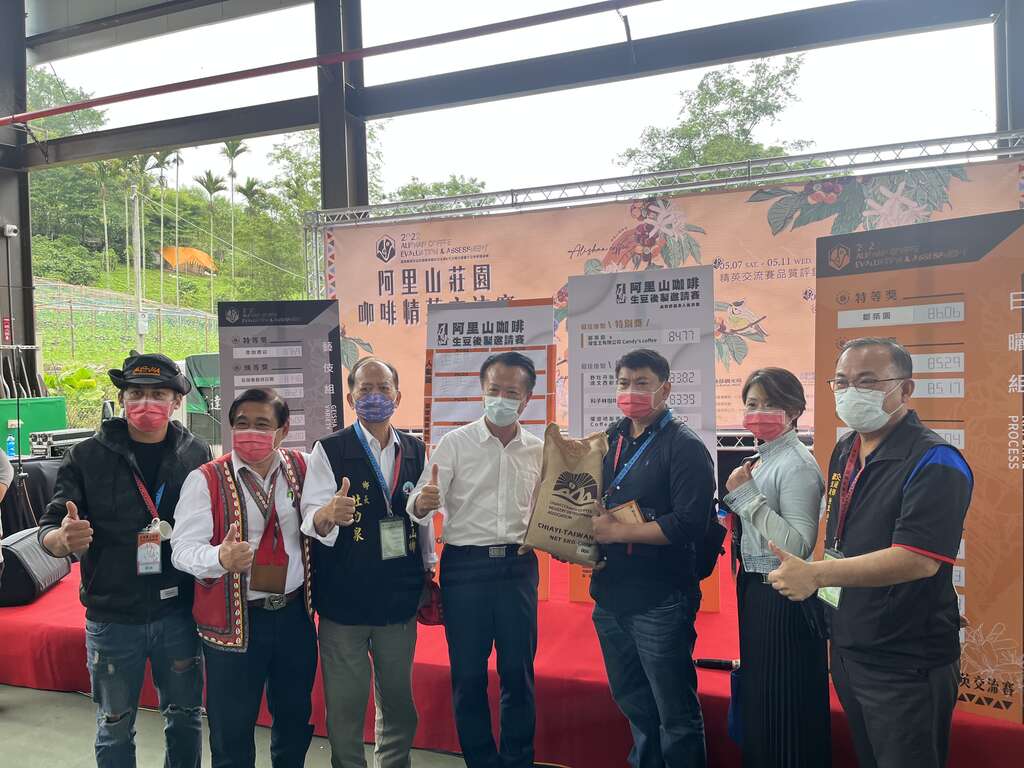 由交通部觀光局阿里山國家風景區管理處(以下簡稱阿里山管理處)、嘉義縣政府、行政院農業委員會水土保持局南投分局及嘉義縣咖啡產業發展協會共同舉辦的「2022嘉義縣阿里山莊園咖啡精英交流賽暨生豆媒合會」,於今(12)日揭曉成績。今年突破往年的參賽紀錄,報名323件,實際繳交290件生豆參加評鑑,在茶業改良場劉千如副研究員擔任主審帶領由世界級的烘焙師、杯測師等組成的評審團評鑑之下,獲得殊榮的咖啡農所產製的生豆不僅得到世界級名師的認證,也將有機會代表嘉義縣角逐全國咖啡豆評鑑競賽,各組別得獎名單如下: