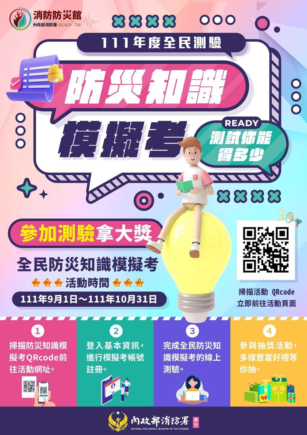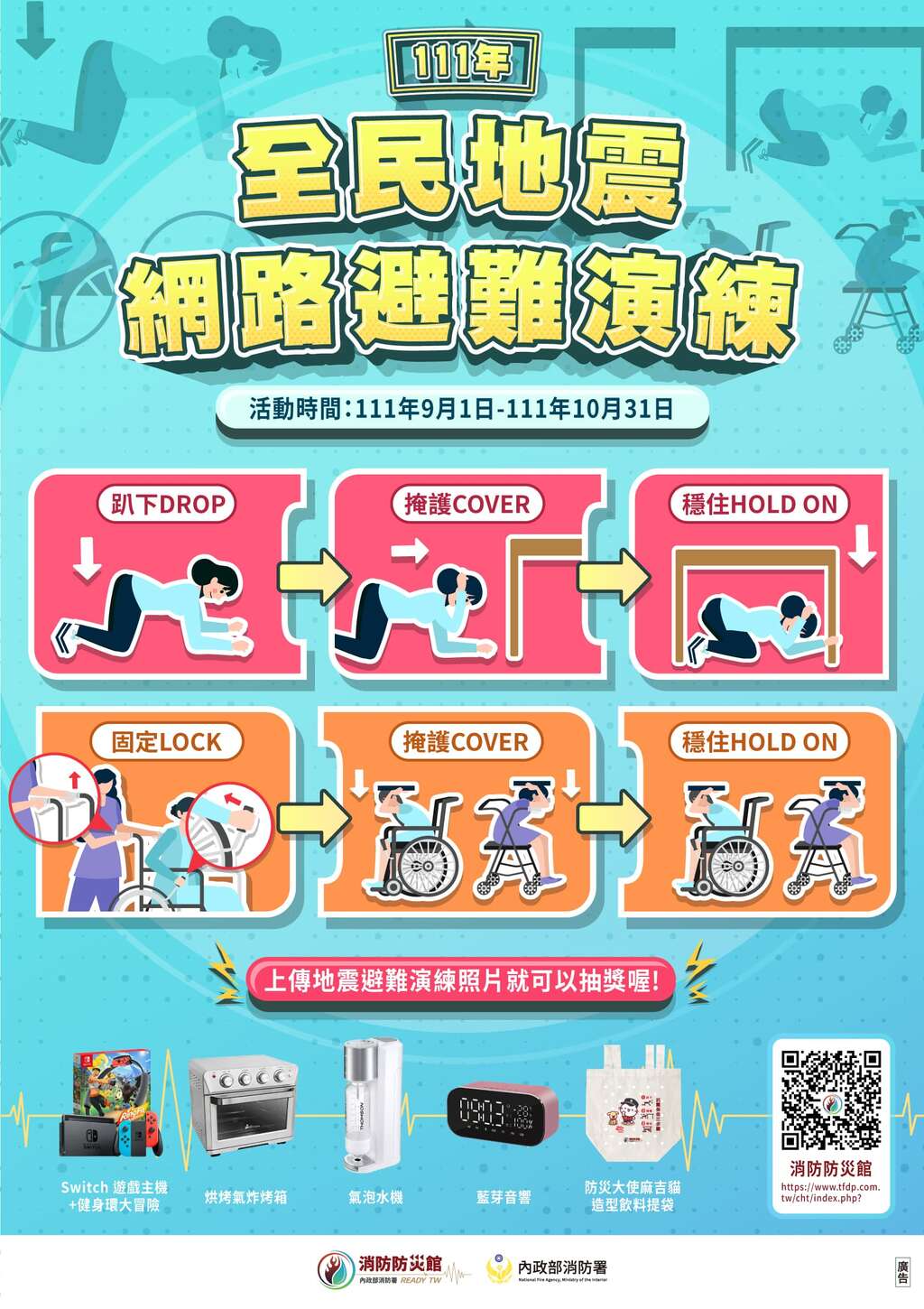 訊息內容111年9月21日辦理「全民地震避難動作演練」,請中央氣象局於上午 9 時 21 分透過「災防告警細胞廣播訊息系統」發布「國家防災日地震警報」訊息,以利進行避難演練。相關照片 上一則 回列表 下一則