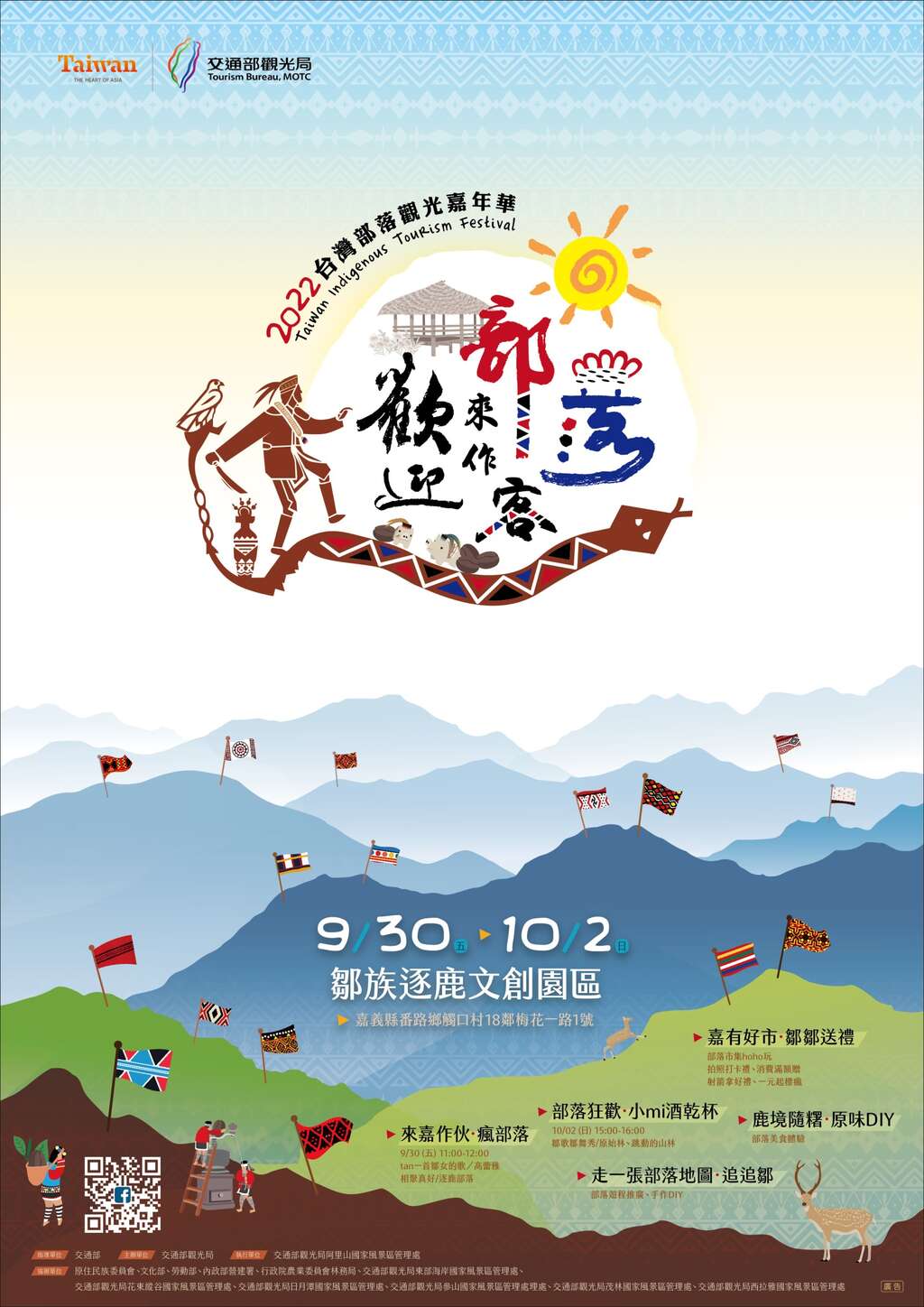 交通部觀光局於今日起(9月30日至10月2日),一連三天在嘉義縣番路鄉鄒族逐鹿文創園區辦理「2022年台灣部落觀光成果嘉年華」活動,邁入第9年的部落觀光成果嘉年華首次移師到風景秀麗的阿里山腳下,由行政院涉及原住民事務的相關部會包括原住民族委員會、文化部、勞動部、內政部營建署、行政院農業委員會林務局及本局轄下阿里山、日月潭、參山、西拉雅、茂林、花東縱谷及東部海岸7個國家風景區管理處共同參展,展現近年來部落觀光的推動成果。今年延續歷年來「歡迎來做部落客」主題,展現台灣原住民16族的部落風貌及文化藝術風采,透過動靜態規劃呈現、情境佈置及各種手作體驗、特色商品,讓民眾體驗走訪部落的樂趣,感受台灣原民文化之美。今天出席嘉年華盛會的有代表交通部出席的觀光局林佩君主任秘書、嘉義縣大家長翁章梁縣長、交通部觀光局所屬阿里山國家風景區管理處洪維新處長、日月潭國家風景區管理處廖錫標副處長、花東縱谷國家風景區管理處郭振陵處長、參山國家風景區管理處曹忠猷處長、西拉雅國家風景區管理處徐振能處長、茂林國家風景區管理處柯建興處長、東部海岸國家風景區管理處林維玲處長、立法院伍麗華委員團隊石羽明特助、原住民族委員會經濟發展處蔡妙凌副處長、原住民族委員會汪啟聖族群委員、內政部營建署玉山國家公園管理處盧淑妃處長、勞動部勞動力發展署李奇玟雲嘉南分署科長、國家發展委員會陳孝雯技正、文化部國立台灣工藝研究中心陳靜汝專員、文化部國立新竹生活美學館陳惠姝秘書、行政院農業委員會林務局嘉義林區管理處張岱處長、行政院農業委員會林務局新竹林區管理處夏榮生處長、嘉義縣議會武清山議員、嘉義縣阿里山鄉鄉公所杜力泉鄉長、嘉義縣番路鄉鄉民代表陳正昇副主席、嘉義縣阿里山鄉鄉民代表汪之龍副主席等地方民意代表及地方農會總幹事、轄內各村社區發展協會、村長、各公協會以及媒體先進等共同參與為部落觀光成果嘉年華揭開序幕。
