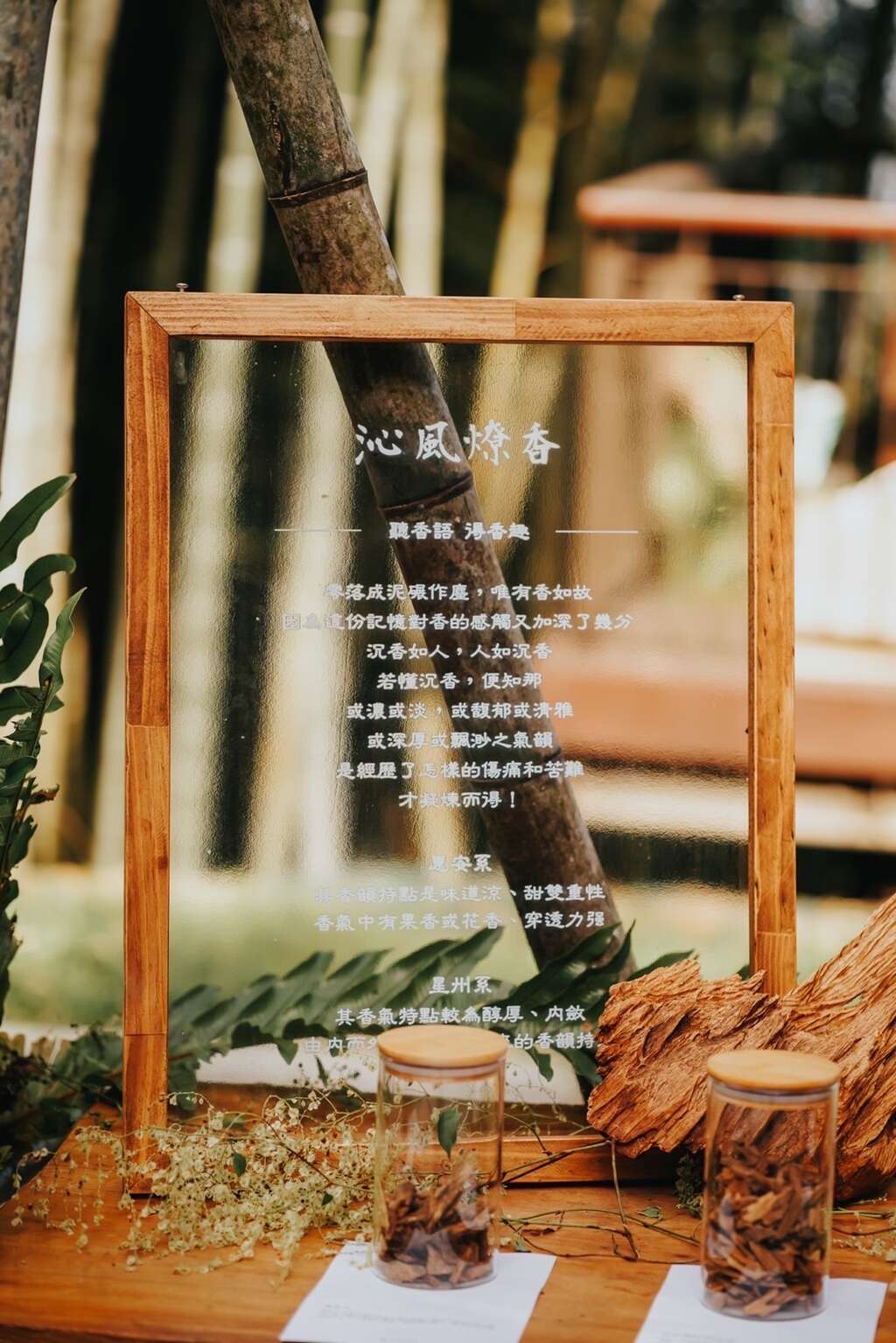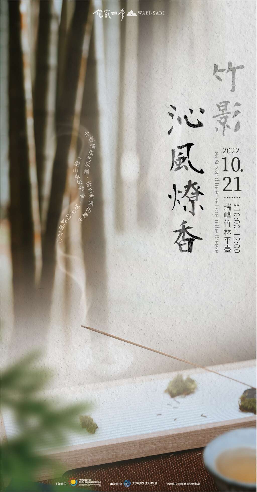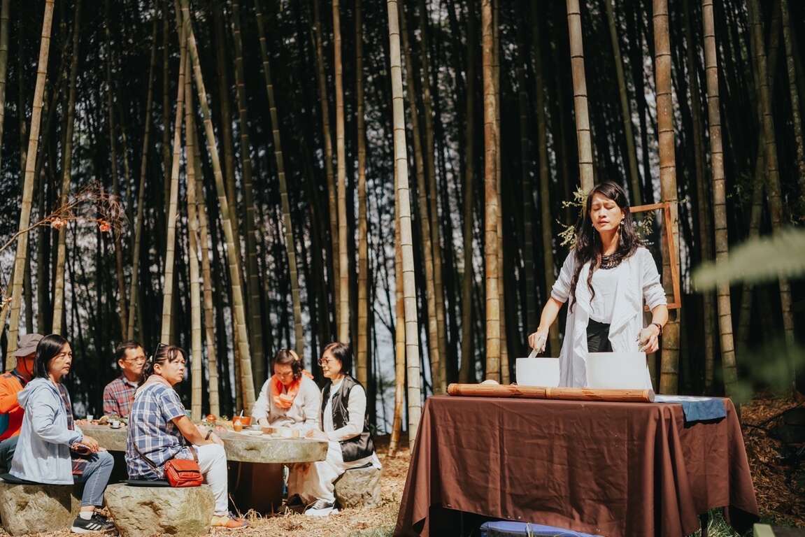 「竹影.沁風燎香」為侘寂四季系列活動,以禪學中的「靜」為核心,由Oneness 聲波療癒跨界樂團的樂音揭開序曲。手碟、古箏、水晶缽、水晶豎琴,和諧舒心的旋律,讓躁動的氣息回歸平靜,茶席中由香道老師與瑞峰社區茶人共同設席,以碳火薰香、篆香展演,香道揉合竹林茶席,點香後茶的氣息會在喉頭與鼻腔留下獨特風味,邀您入山坐席,完全從心靈感受來開啟茶與自我的關係,體驗茶、香結合的六感靜心之旅。