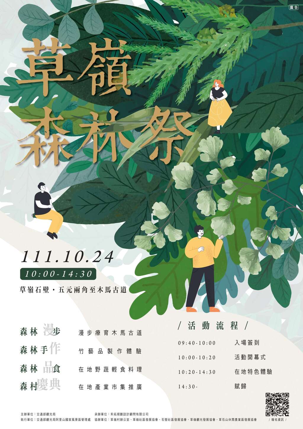 阿里山管理處洪維新處長表示,草嶺森林祭有別於以往,是一場草嶺地方產業夥伴跨組織、跨產業全程參與規劃與執行的活動,在地共有15個產業組織、近50位產業夥伴共同參與推動,為展現在地產業特色,也邀請ㄚ娟小農、一心苦茶油、仙山園(石壁大飯店)、仙夷茗茶、仙霞嶺苦茶油、古峰咖啡莊園、花囍田咖啡莊園、盈盈農圃、陳安邦農園、善計商舖、喬咖啡農莊、雲嶺高山精品咖啡、劉家特產行等業者(依筆畫順序),一同深入山林作為森村慶典的推廣,亦透過森林漫步、森林手作、森林品食等在地特色五感體驗,為山林注入不同的靈魂,開啟來訪山林體驗的旅程。