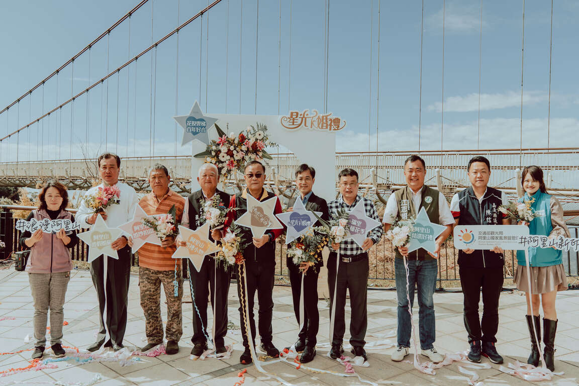 阿里山神木下婚禮品牌至今已持續辦理17年,而打造夜間浪漫指數破百的星光下婚禮迄今(112)年已邁入第5年,今年度首度於嘉義縣梅山鄉太平雲梯辧理,並透過浪漫婚拍串起週邊遊程,而婚紗取景也遍及瑞里紫藤花婚拍點、圓潭生態園區、水社寮車站等,為星光下婚禮刻下「1314一生一世」的浪漫印記。今日記者會在行政院農業委員會水土保持局南投分局分局長陳榮俊、嘉義縣政府縣政顧問李秀美、嘉義縣政府文化觀光局科長沈雅茹、嘉義縣議會議員江志明及議員陳信文、嘉義縣竹崎鄉鄉民代表會代表翁俊宏、嘉義縣梅山鄉民代表會代表吳名周、代表陳皇評及秘書劉啟安、嘉義縣阿里山鄉公所主任莊惠文、嘉義縣阿里山鄉農會理事長安達明轄內各村社區發展協會及村長與各公協會以及各媒體先進等貴賓共同揭開星光下婚禮記者會的序幕。