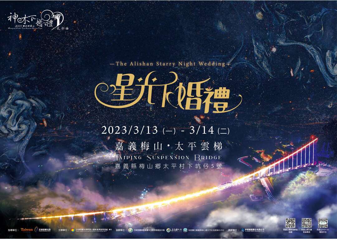 阿里山國家風景區管理處(以下簡稱阿里山管理處)處長洪維新表示今年度婚禮將於3月13日-14日舉行,佈置以「花現雲梯.百年好合」為設計主軸,結合阿里山在地花卉,把現場妝點成如仙境般浪漫且極具儀式感的星光下婚禮,2日的婚拍行程也將串聯「太平藝術之鄉印記」,結合當地手作與植物染體驗,為新人打造阿里山雲霧上的漫旅假期,山林的自然芳香,糅雜人文薈萃的書香,交織出深具層次的極度浪漫,婚拍地點從地景到茶園,感受雲梯茶席的醇厚茶香,手作藝術品的浪漫體驗,層層堆疊,繚繞回憶,積累成新人一生一世的綿延情長。2月1日(星期三)中午於阿里山管理處官網開放報名,將錄取國內外新人15對、報名費用僅9,999元整(象徵愛情長長9999)。往年均有近百對新人搶先報名,期待有更多新人在阿里山互許終生。