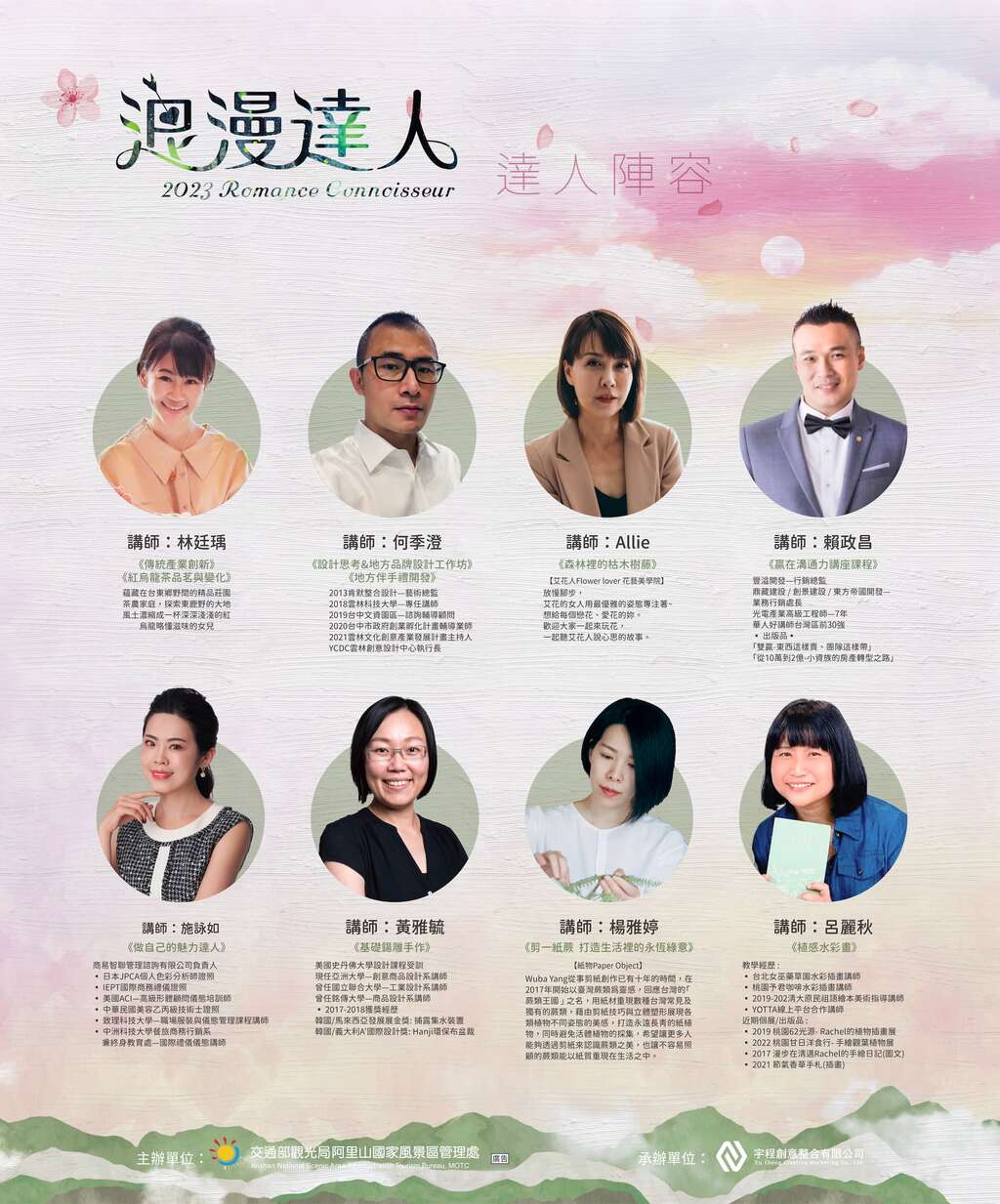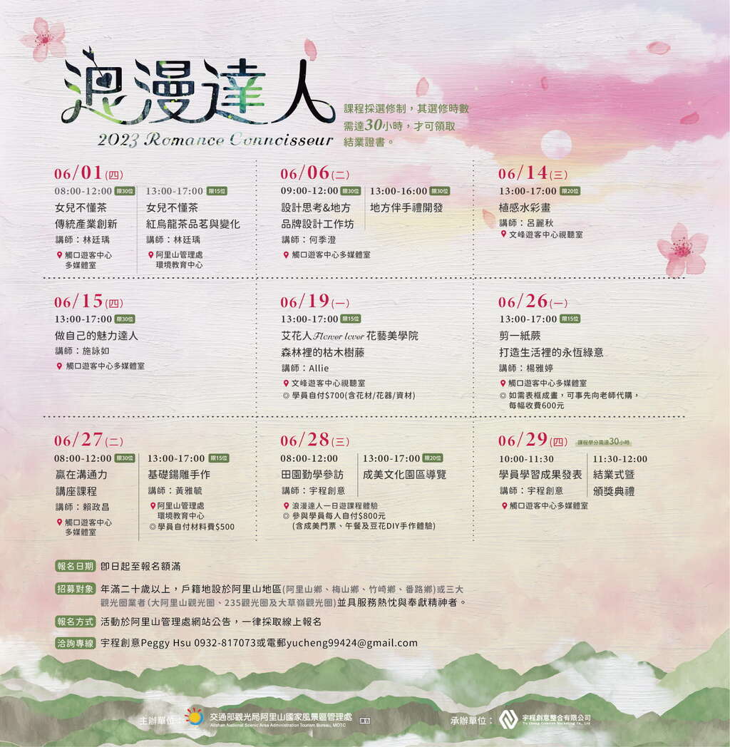 2023年採選修學分制,課程囊括品茗、錫雕、水彩、花藝、剪紙、設計思考等等,還有限額一日浪漫達人遊程,選修時數達30小時即可領取結業證書,希望學員們都能依自身興趣、需求吸收與時俱進的浪漫行銷能力!