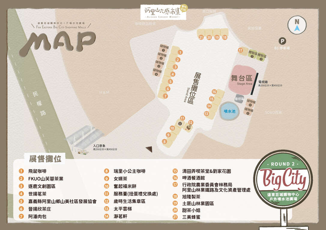 阿里山六感市集in巨城,集結20家阿里山茶葉、咖啡、伴手禮及原民特色商品,包含(飛鼠咖啡、FKUO山芙蓉茶業、逐鹿文創園區、世揚茗茶、晉揚欣茶庄、三美蜂蜜、嘉義縣阿里山鄉山美社區發展協會、瑞里小公主咖啡、女婿茶、奮起福米餅、太平雲梯、瀞茗軒、清田弄喫茶堂&劉家花園、呷酒餐酒館、太平雲梯、行政院農業委員會林務局阿里山林業鐵路及文化資產管理處、旭隆製茶、土匪山林業園區、甜茶小姐、阿潘肉包…等),呈現阿里山富饒、具有故事與人情味的在地特產,就算人在新竹也能即時購入阿里山特產、感受阿里山歲時生活的美好。另外,現場的歲時生活集章區也準備了歲時明信片開放集章迷把阿里山完整收藏。