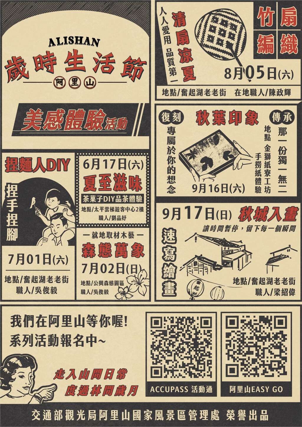 阿里山的歲月懷舊時光之旅,邀請各位旅人一同出發~讓我們重回到舊時鄉間山村,有如遠離喧囂塵世之情境氛圍,一起沉浸在著名作家筆下的情境,動手做茶點品茶賞風景;又或者來動動靈活的手指,捏出童年回憶的捏麵人;體會舊時林業,一起探索就地取材製作專屬旅行木藝品;暑氣正旺,編織涼爽竹扇漫步在奮起湖山林步道中;秋葉入序,重回舊時工藝體會造紙的技藝;拾起畫筆揮灑色彩,描繪奮起湖懷舊的景象,與屬於自己的獨特旅行記憶!