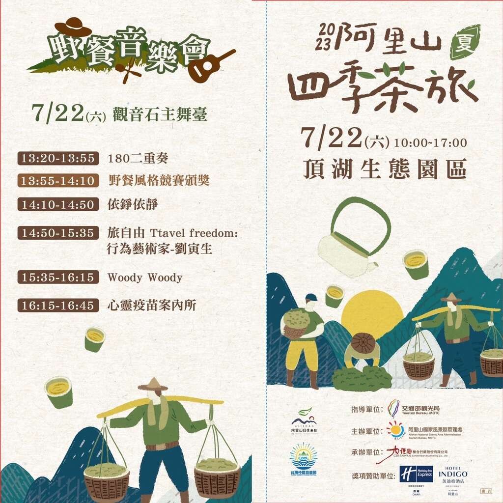 下午則是精心安排夏日野餐音樂會,結合音樂演奏、人聲演唱、行為藝術等,融合自然場域環境的表演,讓音樂與藝術在山林間迴盪。包括知名行為藝術家、金曲獎最佳組合二重唱及演奏團體等,以鋼琴、薩克斯風、排笛等樂器,帶來一首首清新又耳熟能詳的經典好音樂,感受阿里山生活的放鬆愜意,洗滌生活裡的繁瑣,享受阿里山茶的純淨美好。