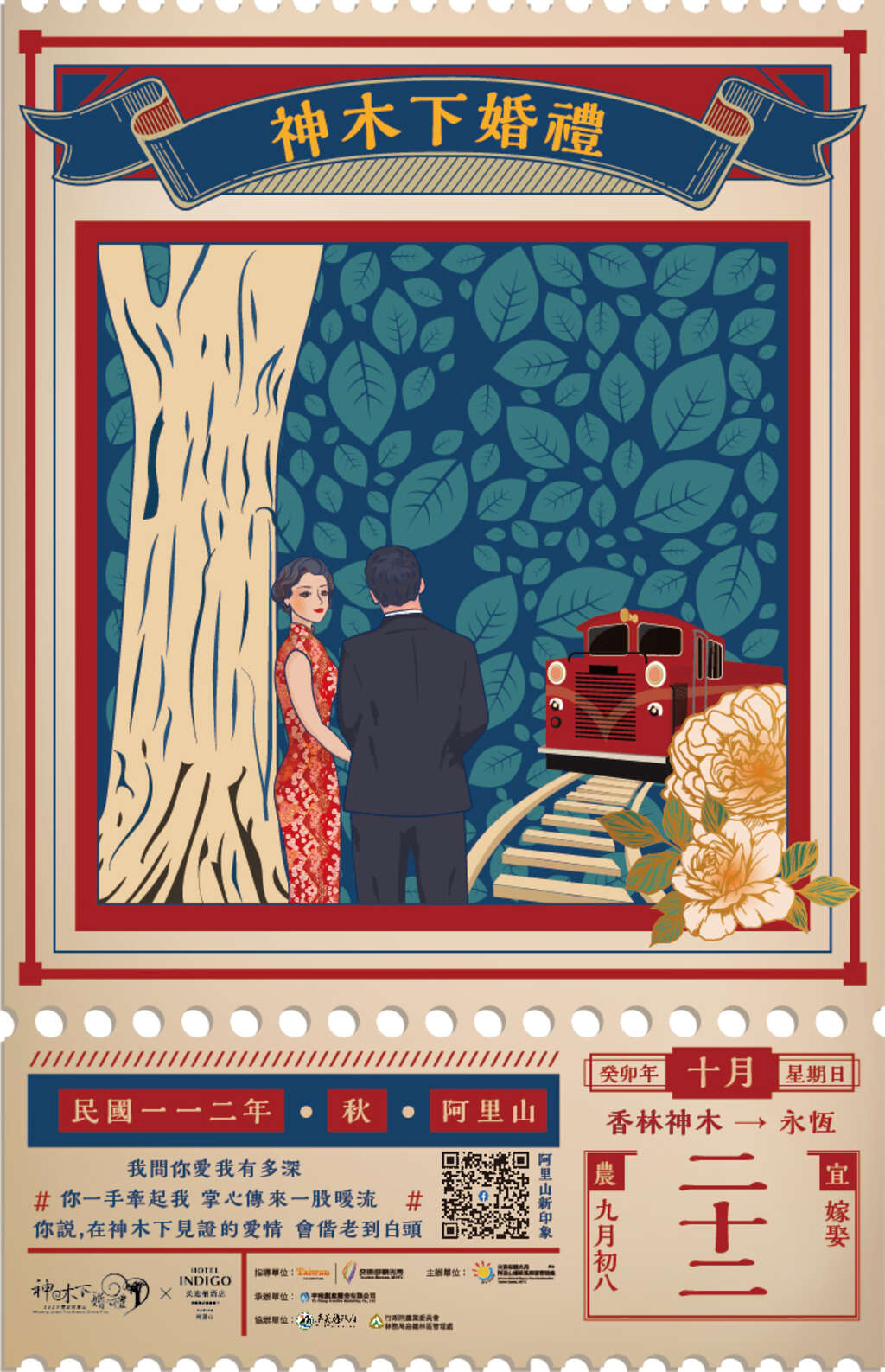 邁入第17年的神木下婚禮承襲鄒族部落婚禮體驗、香林神木證婚兩大特色儀式,通過部落婚禮充滿寓意的結婚習俗,將新人的結合化作留存心間的雋永感受,同時置身香林神木群構成的森林系婚禮場景,於神木前互許真愛諾言。今年阿里山管理處將在10月的婚禮活動上,藉由神木亙古長遠來見證愛情的永恆,融入中式婚禮的典雅意境、15對新人將著中式旗袍於百年神木下證婚的刻畫最美印記外,更安排入住海拔最高國際連鎖酒店【阿里山英迪格酒店】,感受依偎在房間陽台,即可親臨山林、雲海、日出、星空等阿里山夢幻地景。