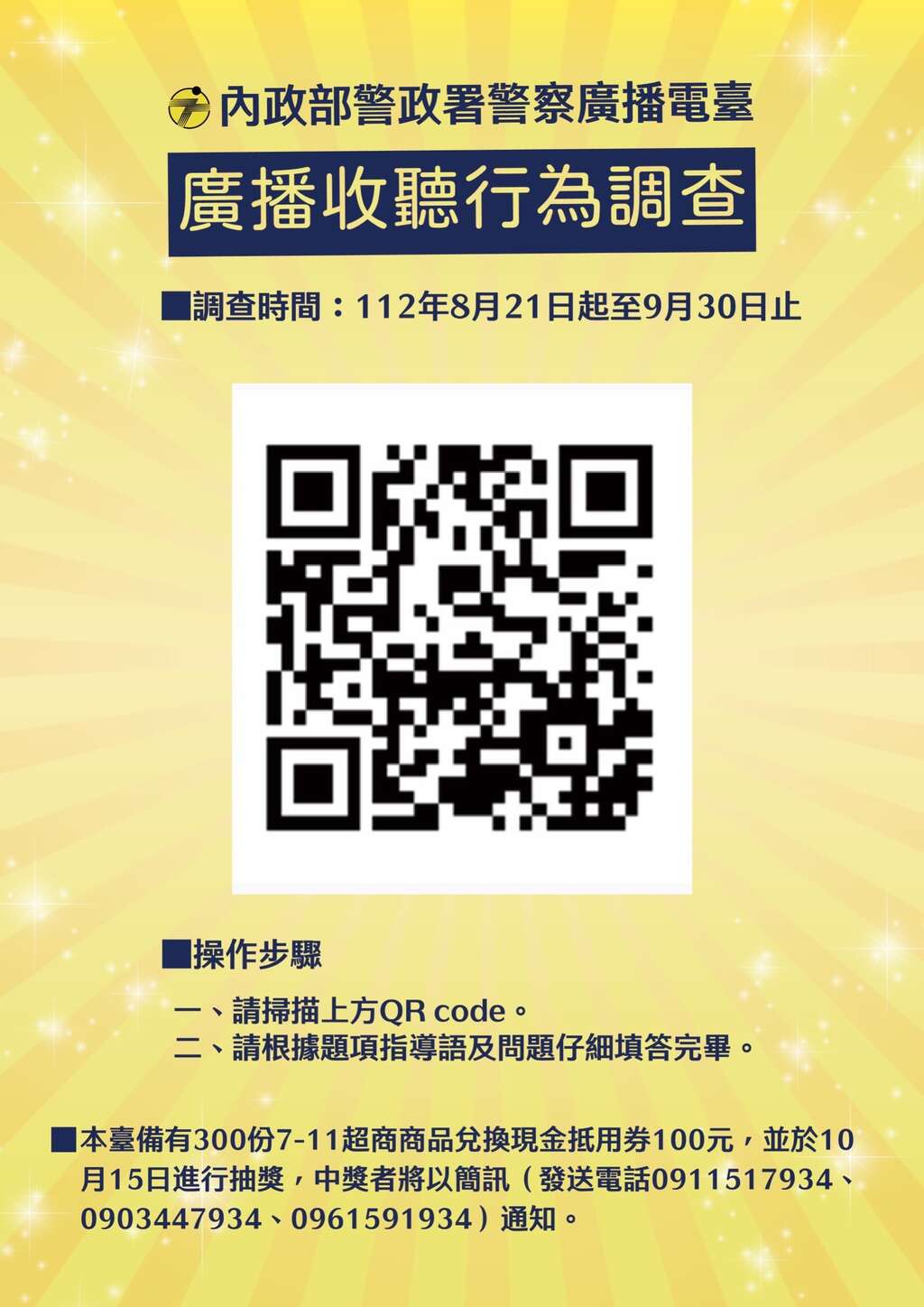警察廣播電臺辦理112年廣播收聽行為調查,完成問卷可參加抽獎活動,歡迎填寫問卷調查。