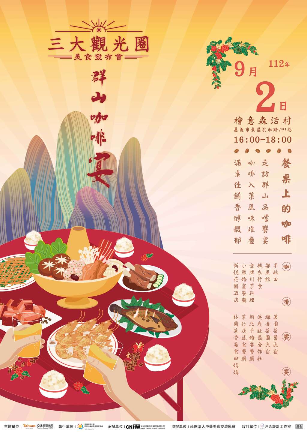 群山咖啡宴展區由中華美食交流協會理事長駱進漢率團隊包含金山兄弟食堂行政主廚郭宏徹、新天地餐廳廚藝藝術總監吳文智、宏銘的廚房總監黃宏銘、水鳥和洋創作料理營運總監陳冠宇、大葉大學餐旅管理學系專技教授彭建治,組成美食輔導六人團隊,歷經三個多月招募與培力決選出12家觀光圈餐飲業者,包含新悦花園酒店(新悦咖啡饗宴)、金牌川菜小館(咖啡食光)、新北平婚宴餐廳(新北平咖啡里山宴)、半畝田北方麵食館(咖啡傳香飄桃城)、小原婚宴餐廳(啡嚐饗嘉群山宴)、草行居蔬食餐廳(大咖飛躍聚諸羅)、茗園茶葉民宿(阿里山群山啡躍)、逐鹿社區合作社(噢馬啡饗宴)、鄒風館(啡嚐山野)、楓衣竹食(垛磨達吉tomodachi)、林園茶香美食田媽媽(雲饗咖啡宴)、綠香茶園民宿(啡嚐食期),以咖啡入菜、創新料理,呈現12套咖啡饗宴,並融入在地文化、風土食材豐富料理獨特性,而在味蕾創新上品味咖啡入菜的酸甜苦辣,滋味包羅萬象,呈現咖啡美食新體驗。