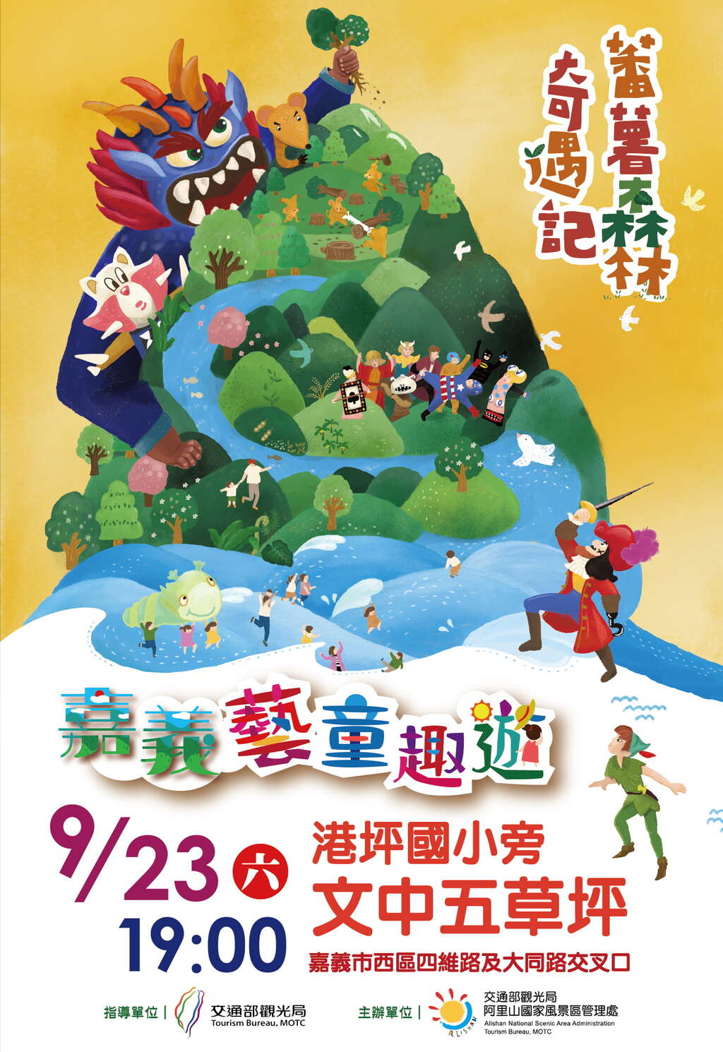 交通部觀光署阿里山國家風景區管理處為行銷觀光圈內之區域觀光產業,首次與紙風車劇團合作舉辦「嘉義藝童趣遊-蕃薯森林奇遇記」藝文活動,將於112年9月23日(星期六)晚上7時於嘉義市港坪國小旁文中五草坪(大同路及四維路交叉路口)熱鬧演出,本劇以傳遞愛護山林、愛護動物、團隊合作的重要精神,透過展演者鮮豔且多變的造型及豐富的舞台互動情境,啟發大小朋友從生活中愛護森林及生態。