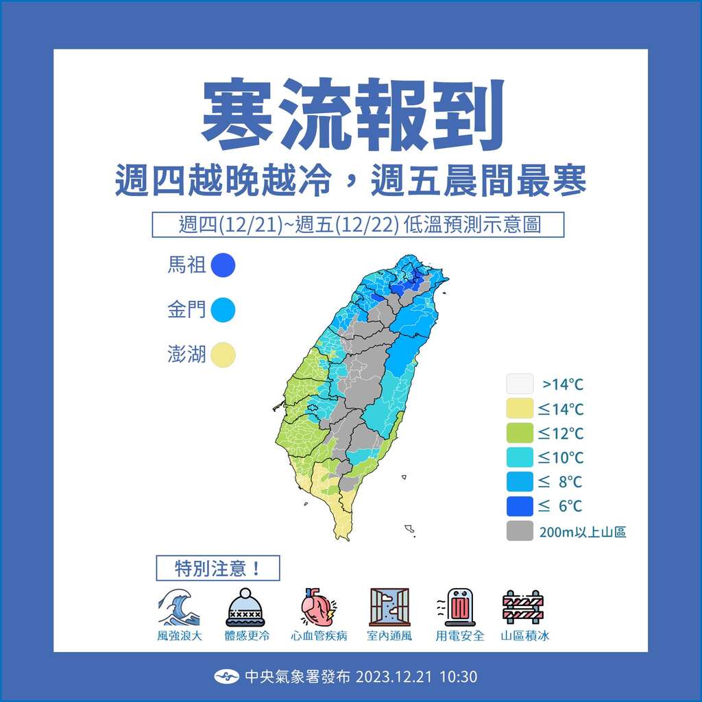 此波寒流來襲,12/21(四)-12/23(六)臺灣各地包括外島,低溫將在攝氏10度以下,請預計進入高海拔風景區之旅客(尤其是年長者或有心血管疾病遊客者)加強低溫防護保暖措施,阿里山國家風景區關心您。