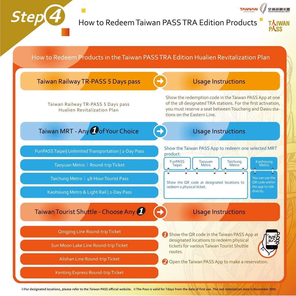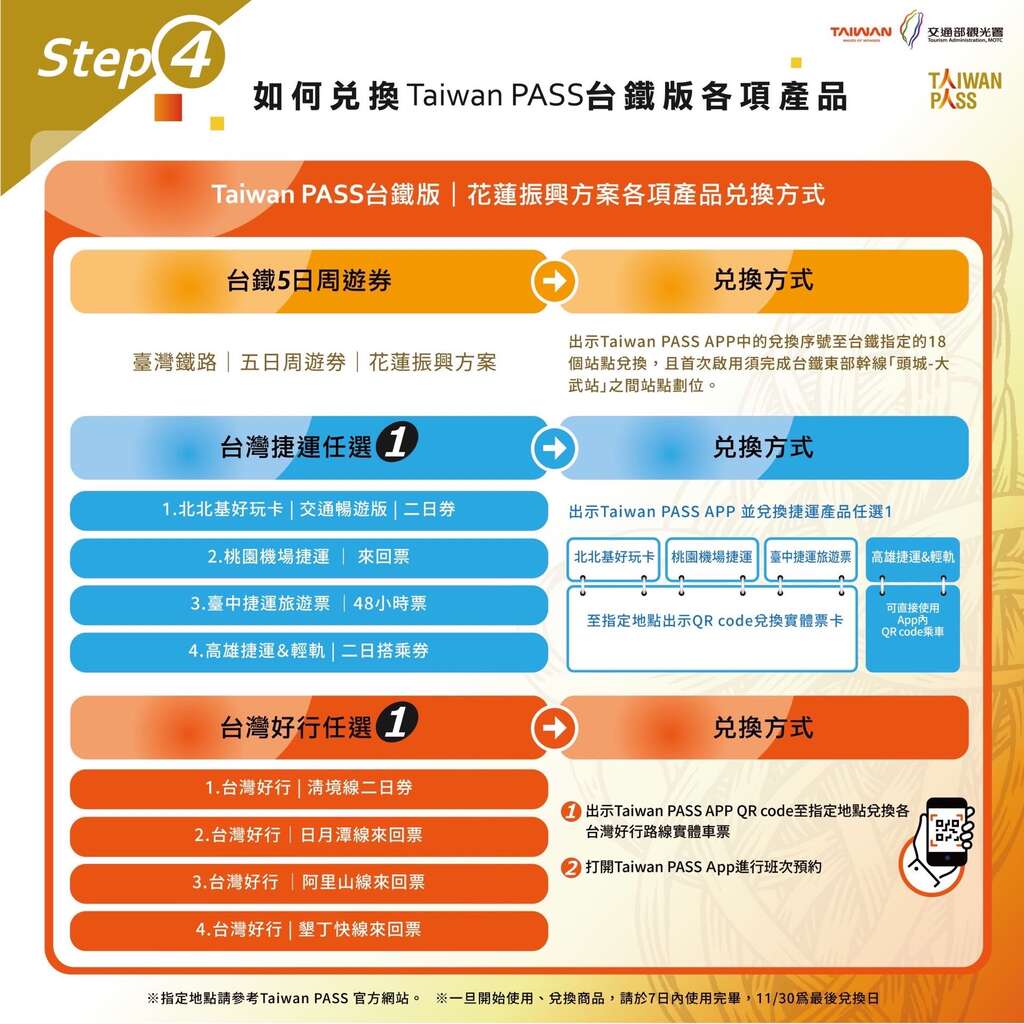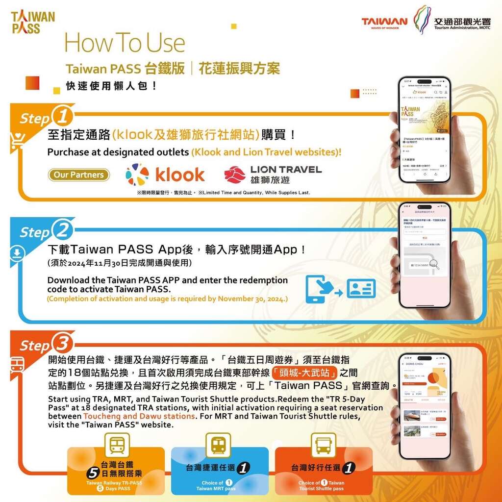 觀光署亦提醒,「Taiwan PASS-台鐵版(花蓮振興方案)」須至指定通路(Klook及雄獅旅行社網站)購買,下載Taiwan PASS App並輸入兌換序號即可開通。「台鐵五日周遊券」須至台鐵指定18個站點(臺東、花蓮、羅東、宜蘭、南港、松山、臺北、板橋、桃園、中壢、新竹、臺中、新烏日、嘉義、臺南、新左營、高雄、枋寮等)兌換,且首次啟用須完成台鐵東部幹線「宜蘭頭城-台東大武站」之間站點劃位,並於今(113)年11月30日完成開通與使用。產品適用車種為3000型自強號、普悠瑪、太魯閣、自強號、莒光號及區間(快)車,但除自強、莒光號及區間(快)車外,其他車種均須事先劃位確認擁有對號座才可搭乘,更多詳細規範可至台鐵官網查詢。而捷運及台灣好行之兌換使用規定,可至Taiwan PASS官網查詢。