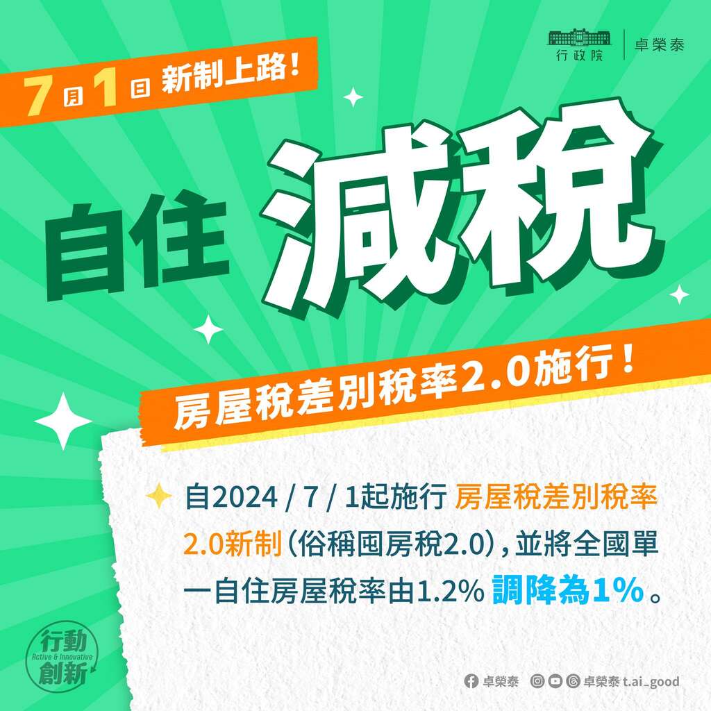🔸房屋稅差別稅率2.0上路,全國單一自住房屋稅率調降為1%