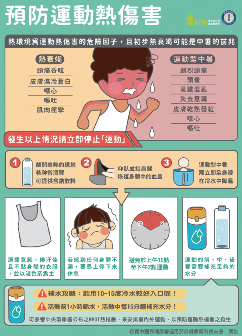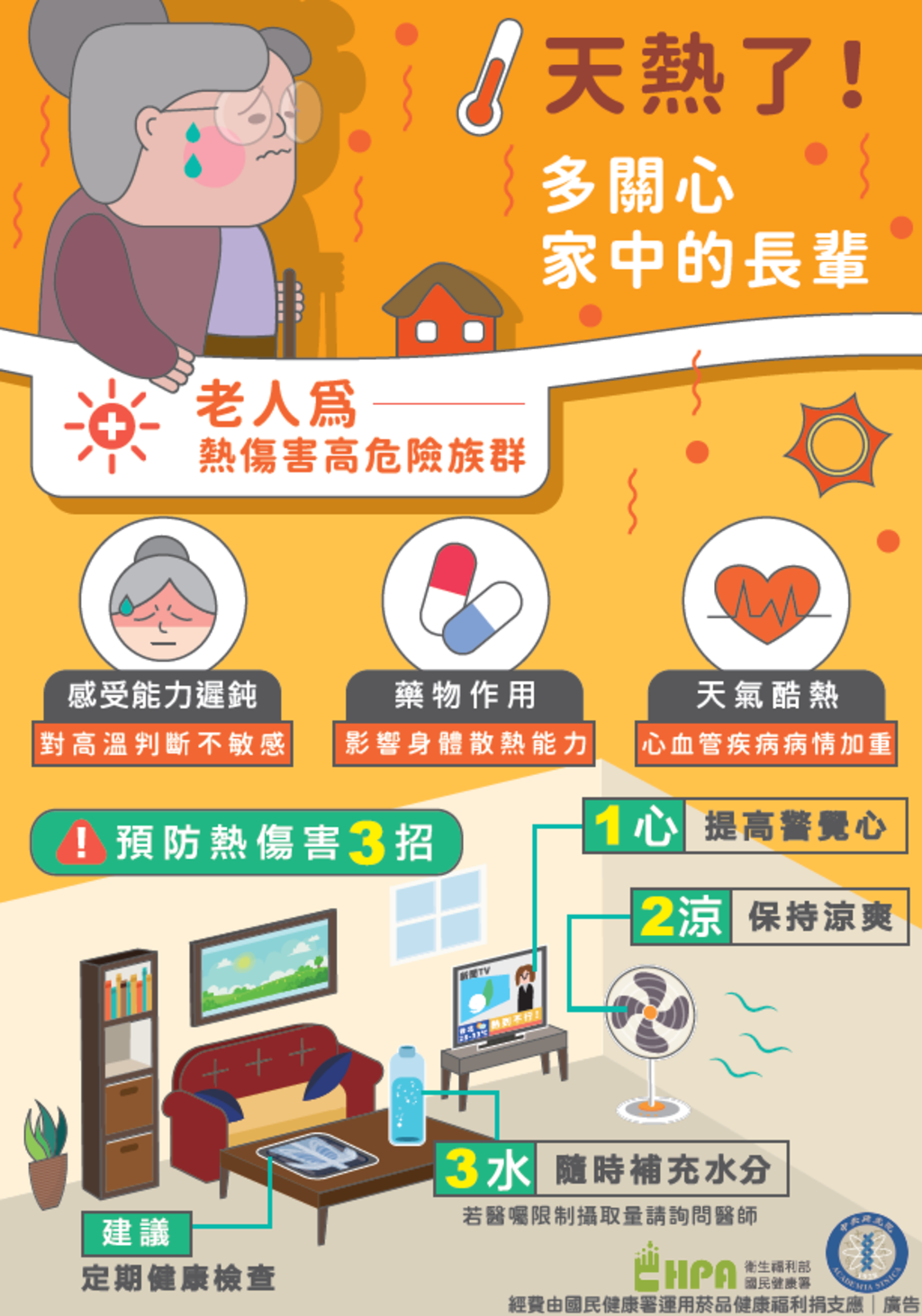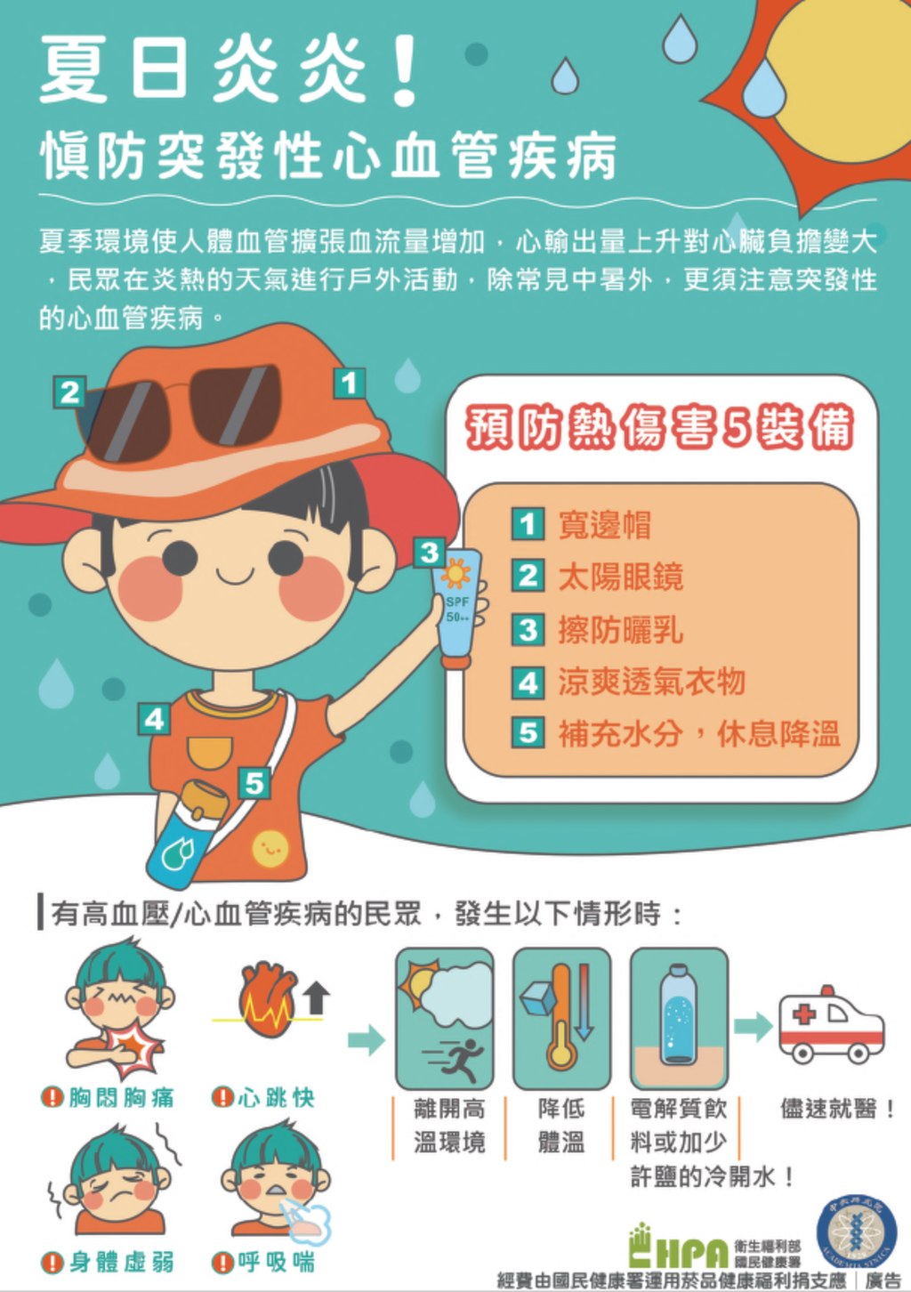訊息內容在全球暖化趨勢下,我國近年受氣候變遷影響造成氣溫偏高,若無適當防護措施任何人都有可能會發生熱傷害,尤其是脆弱族群,如嬰幼童、高齡者(如長照機構、居家、獨居)、慢性病者、服用藥物者、戶外活動者(如運動員、外送人員等)及過重者等,容易因高溫而造成熱傷害。 提醒民眾在夏日高溫時,應注意避免或減少曝曬於高溫環境下,並保持「涼」爽、「補」充分水分及提高警覺「心」,以預防熱傷害的發生。相關照片 上一則 回列表 下一則