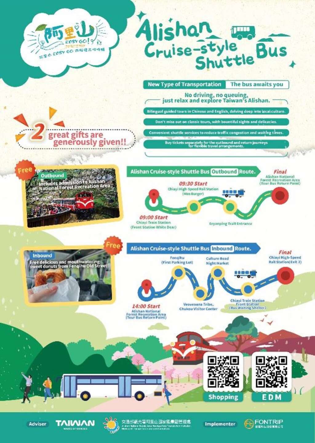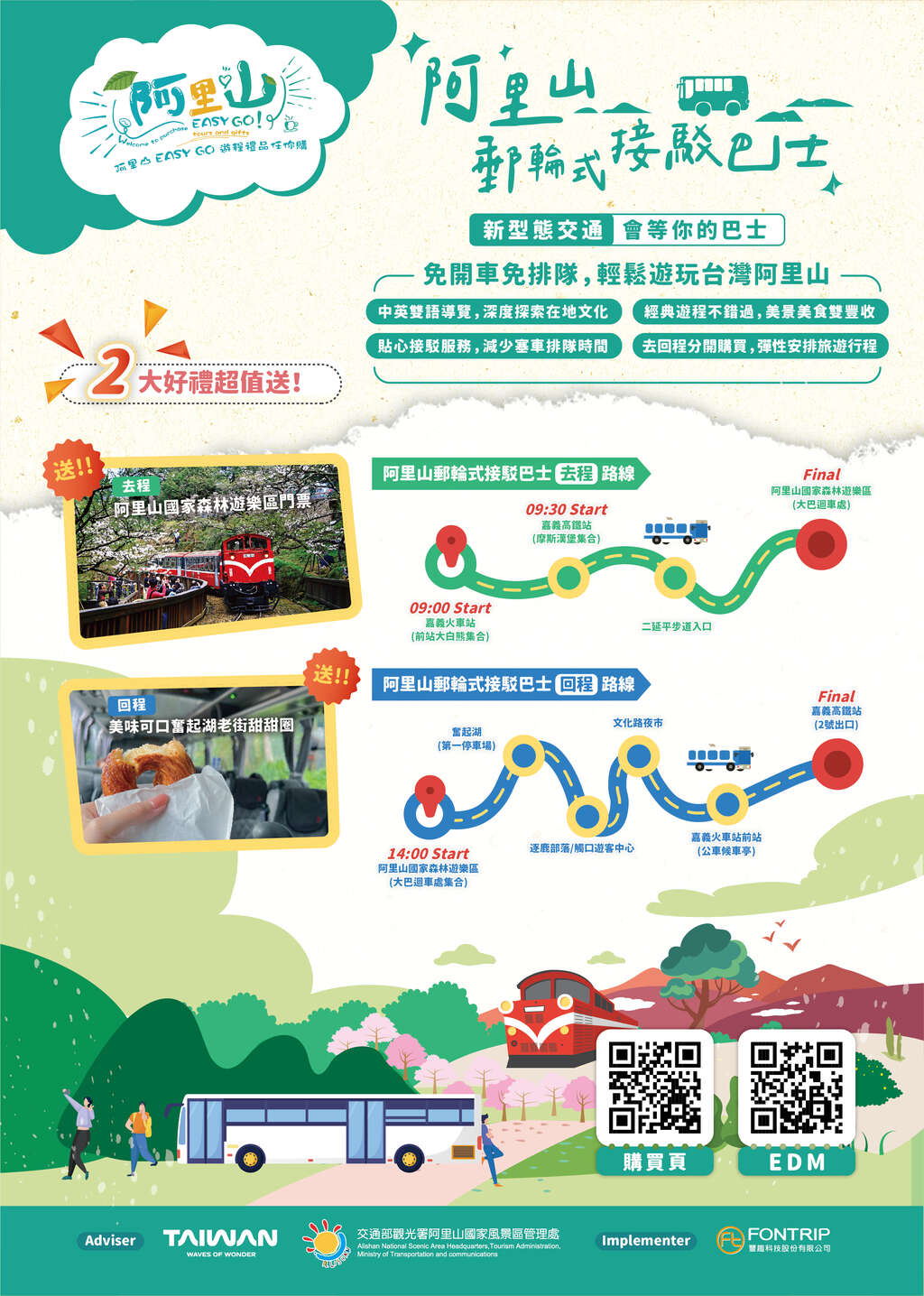 「阿里山郵輪式接駁巴士」專為海外旅客設計,提供便利的交通選擇,從嘉義高鐵站及火車站出發,沿途停靠阿里山周邊的知名景點,包括二延平步道,終點站為阿里山森林遊樂區。回程則經過奮起湖、逐鹿社區/觸口遊客中心、文化路夜市等景點,隨車配有專屬中英導遊,替這趟旅途增添導覽解說的寶貴體驗,並提供去程與回程可分開訂購的彈性選擇,票價親民,來回程票券僅需新臺幣(以下同)1,050元,讓海外旅客既能節省交通費用,又能靈活安排旅程。