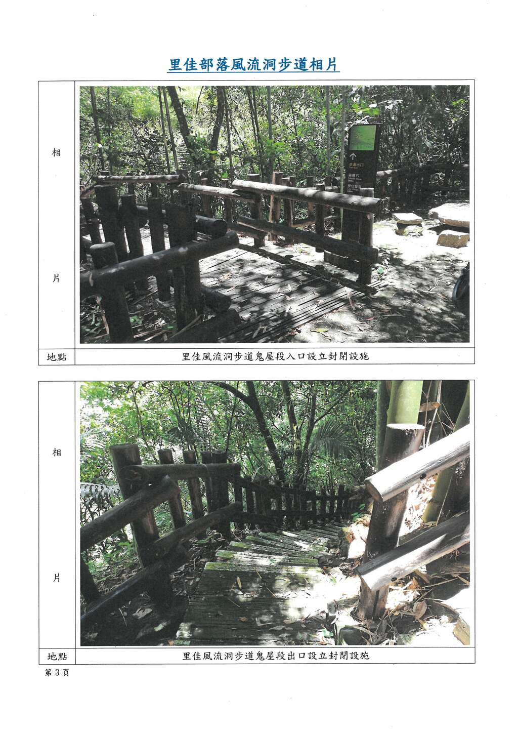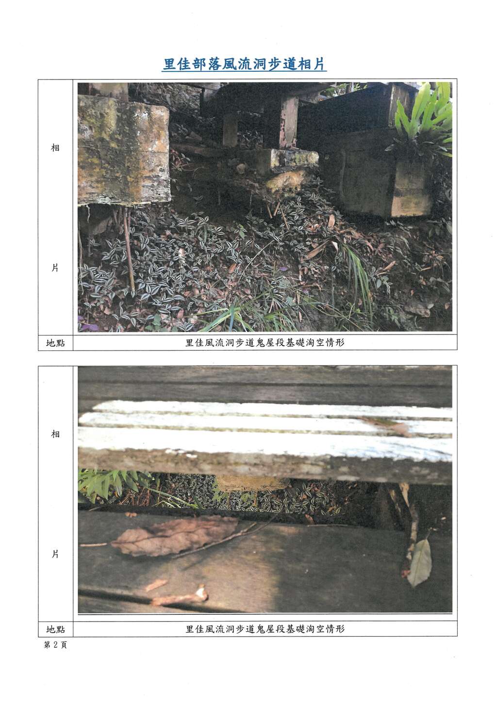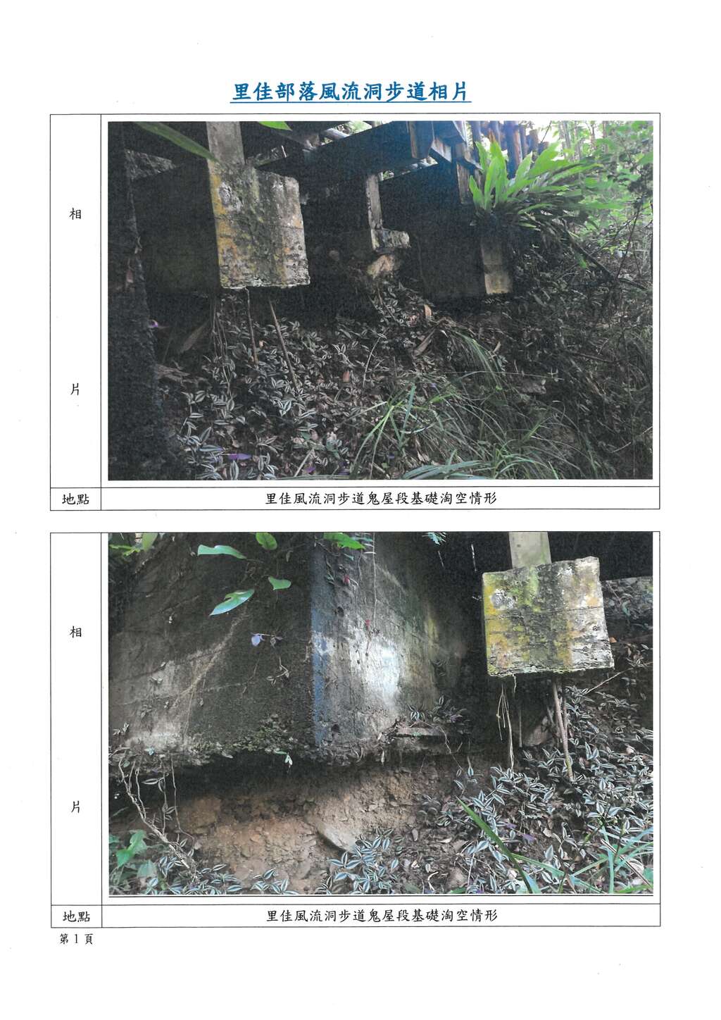 訊息內容本處里佳部落風流洞步道,步道鬼屋木棧道路段(詳如照片),受連日豪雨木棧道基礎邊坡崩塌淘空(詳如相片),且周邊地質邊坡滑動土石敏感不穩狀態,隨時造成木棧道塌陷損壞危險,因量體太大短時間無法立即修復,為顧及遊客安全,故將本路段暫時封閉禁止進入,待修復完再行開放,敬請見諒。相關照片 上一則 回列表 下一則