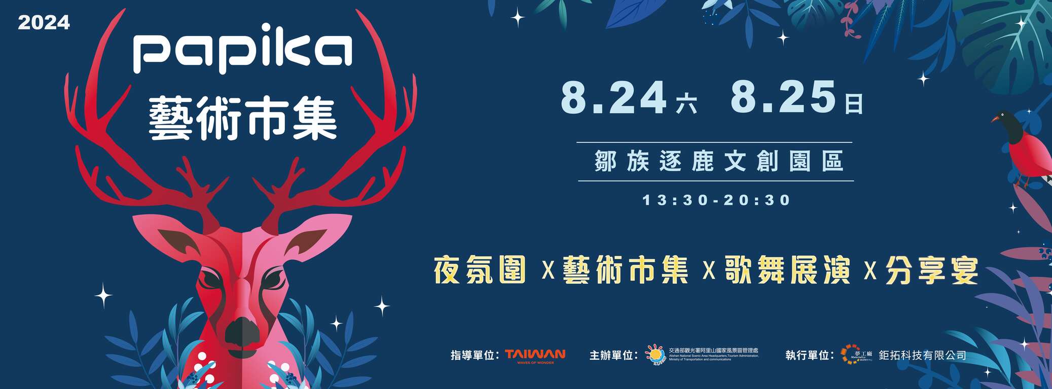 「2024 papika藝術市集」另將於市集活動的夜間安排原民樂舞演出,8月24日(星期六)由鄒族山美部落族人與泰雅族瑞岩部落族人共同演出創新舞碼「山的那一邊」,表達在遠古時期,不同的族群在同一片天空下各自發展出獨特的傳統工藝、歌謠文化、祭祀禮儀、生活方式等等,對映到如今的族群互助共生共融,讓兩族群的神話、傳說,充滿高度藝術想像;8月25日(星期日)則由逐鹿表演藝術團演譯鄒族神話故事「解碼鄒傳說」定目劇,傳達人與動物、山林間的友善,讓觀眾思考森林生態的維護及如何維持生態平衡。表演內容精彩可期,絕對讓遊客們對於原民歌舞的展現耳目一新,演出期間還將贈送精美活動禮品,為期2天的活動豐富精彩,好朋友們一定要把握這次千載難逢的好機會。
