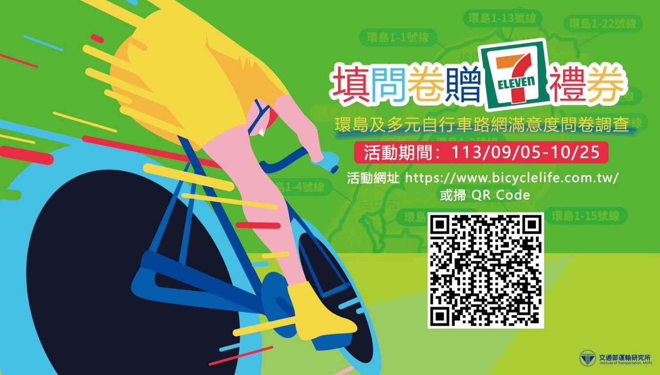 訊息內容為瞭解自行車騎士對於交通部推動環島及多元自行車路線之滿意度,交通部運輸研究所援例於113年針對112年前已完工路線辦理「環島及多元自行車路網滿意度問卷」調查,以利提出後續年度之自行車路線優化建議事項。 為擴大蒐集自行車友之意見,運輸研究所製作「環島及多元自行車路網滿意度問卷」電子宣傳文宣如附件,歡迎自行車友於網路上填答,回饋實地騎乘之體驗。相關照片 上一則 回列表 下一則