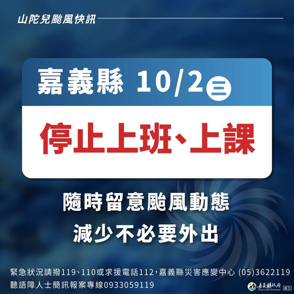 因應山陀兒颱風影響,10/2(三)阿里山全區(阿里山鄉、梅山鄉、竹崎鄉、番路鄉)遊憩景點設施及步道預警性封閉,嘉義縣政府宣布全天停班停課,本處【觸口遊客中心】、【文峰遊客中心】及【里佳資訊站】閉館一天。